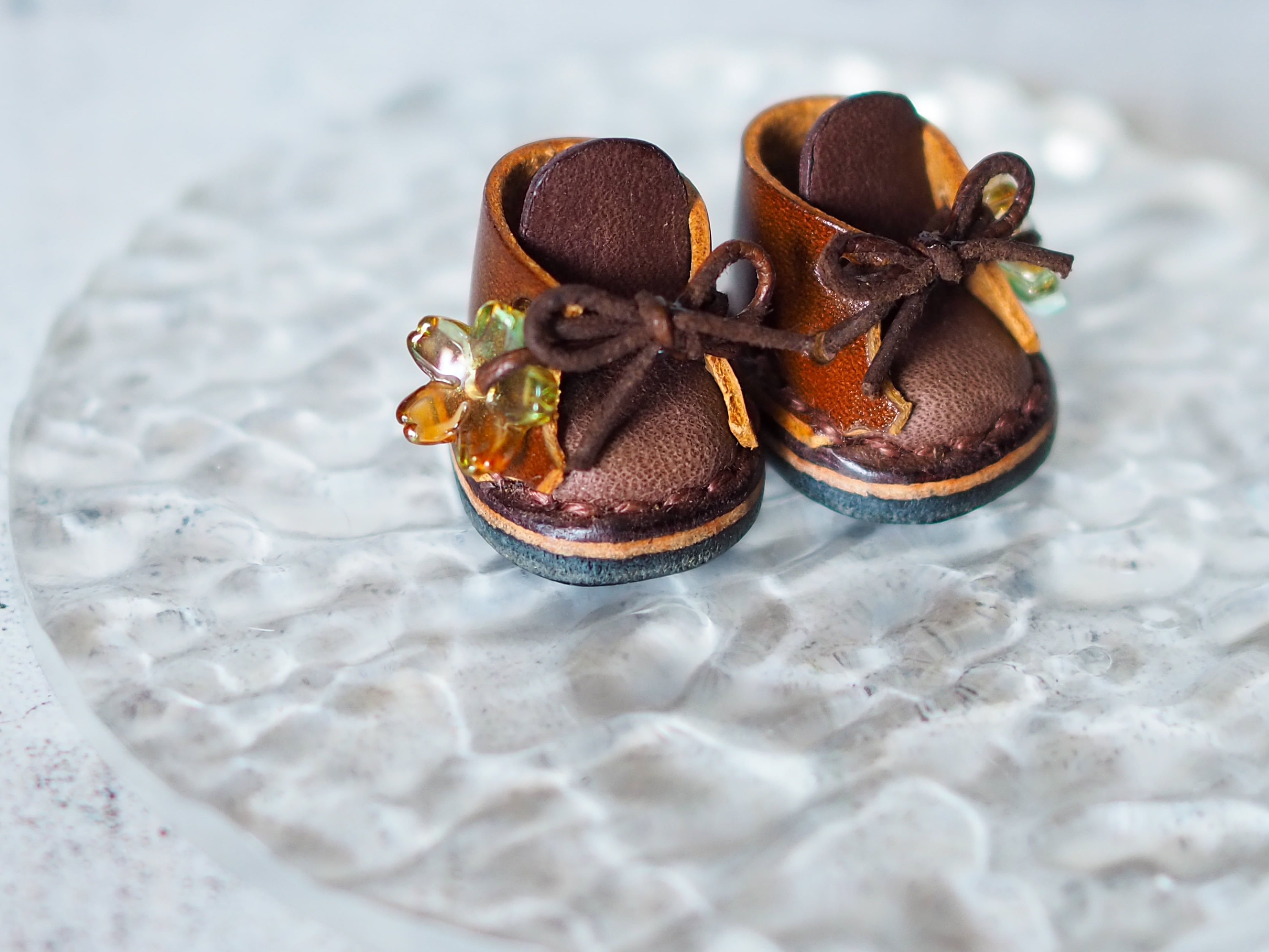 本革にて製作したぬい靴に、ガラスのお花を飾ったぬい靴です。試着は10cm~12cmの我が家のぬい達が担当しています。 履いてバランスを取っていただくことで自立のお手伝いをいたします。