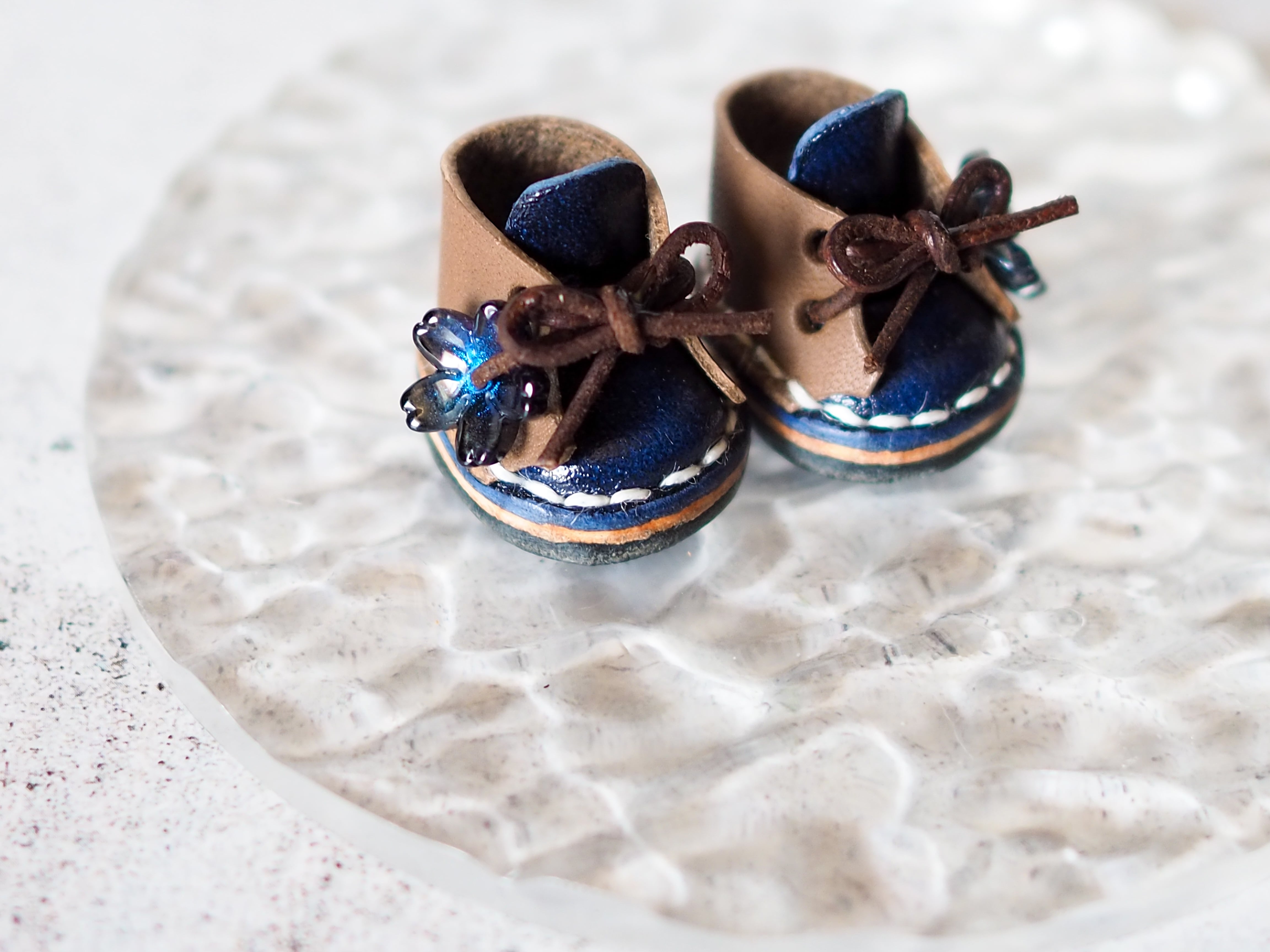 本体を本革にて製作したぬい靴にグリッターが上品に輝くガラス製のお花を飾りました。