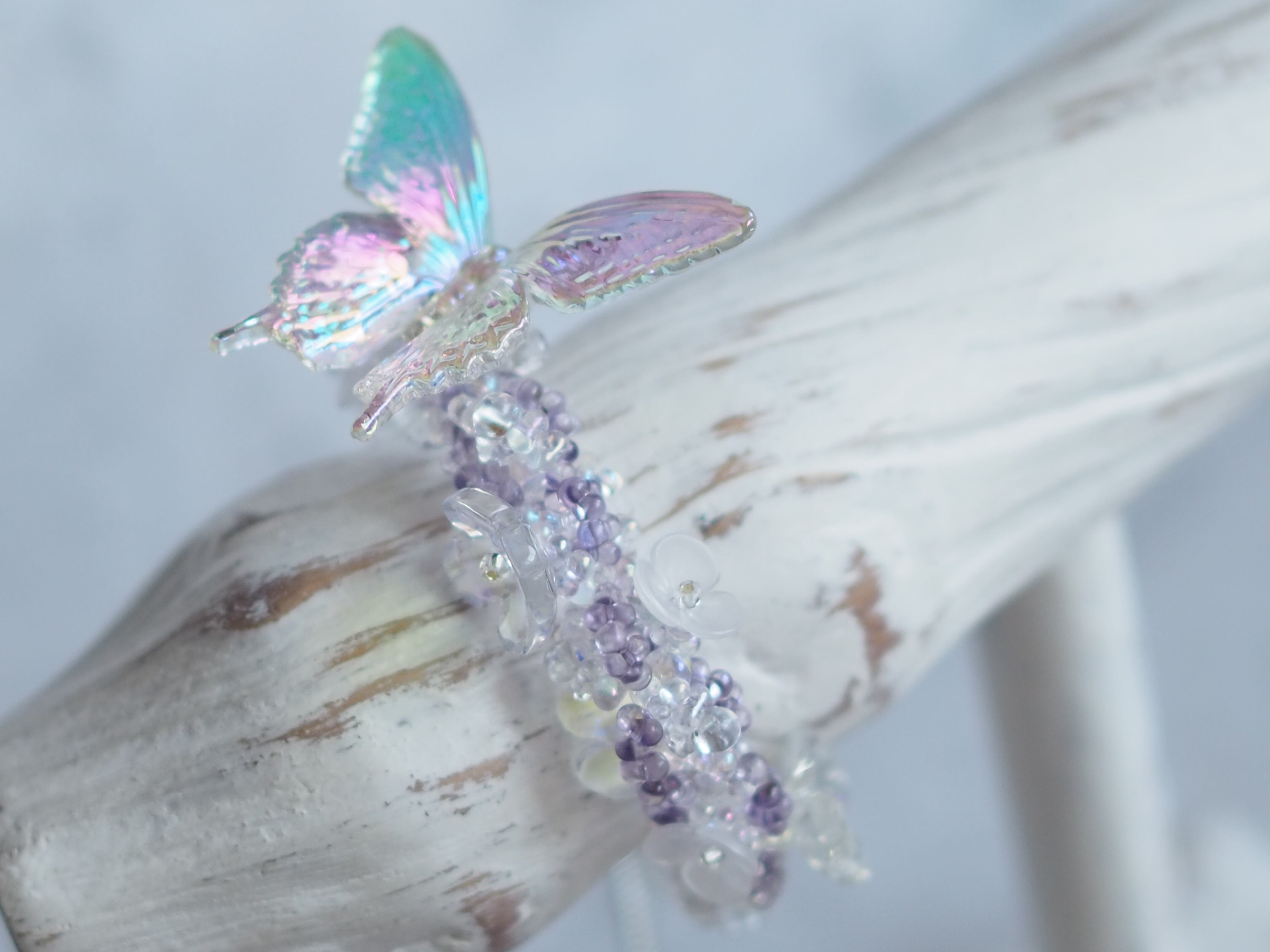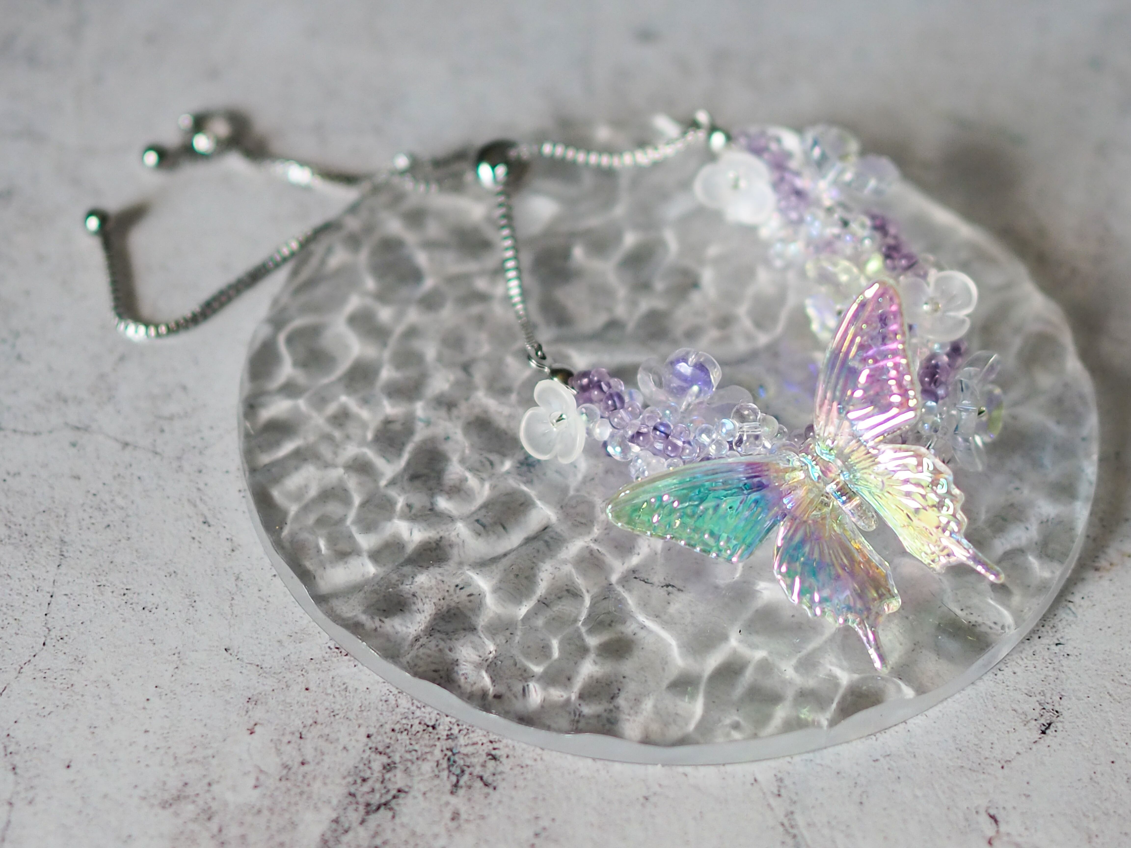 ◾︎素材:ガラスビーズ、ガラスパーツ、樹脂パーツ(蝶)、チェーン、スライドボール等金具(サージカルステンレス(SUS304))、テグス(ナイロンモノフィラメント)