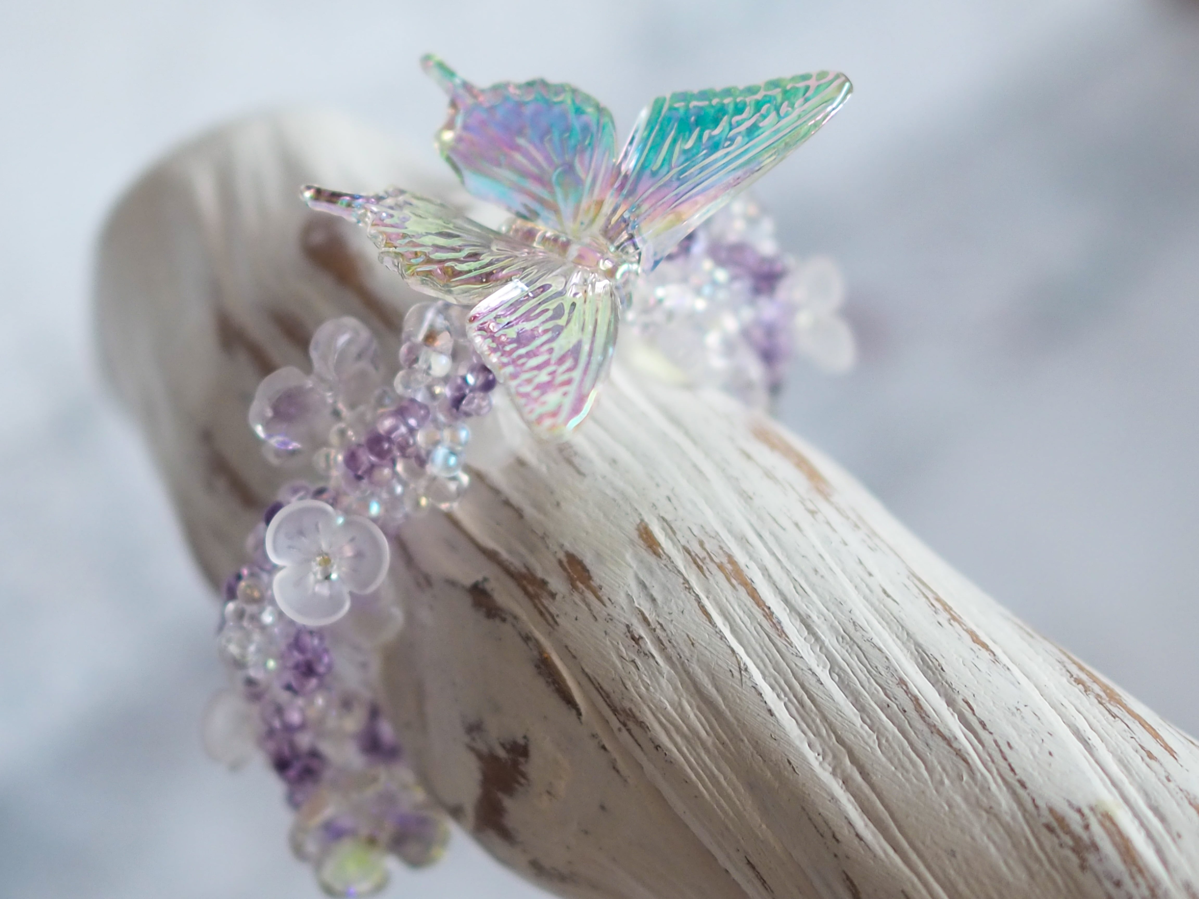 チェコガラスビーズとガラス製のお花パーツ、そして華麗な蝶のモチーフを丁寧に編み上げたブレスレットです。