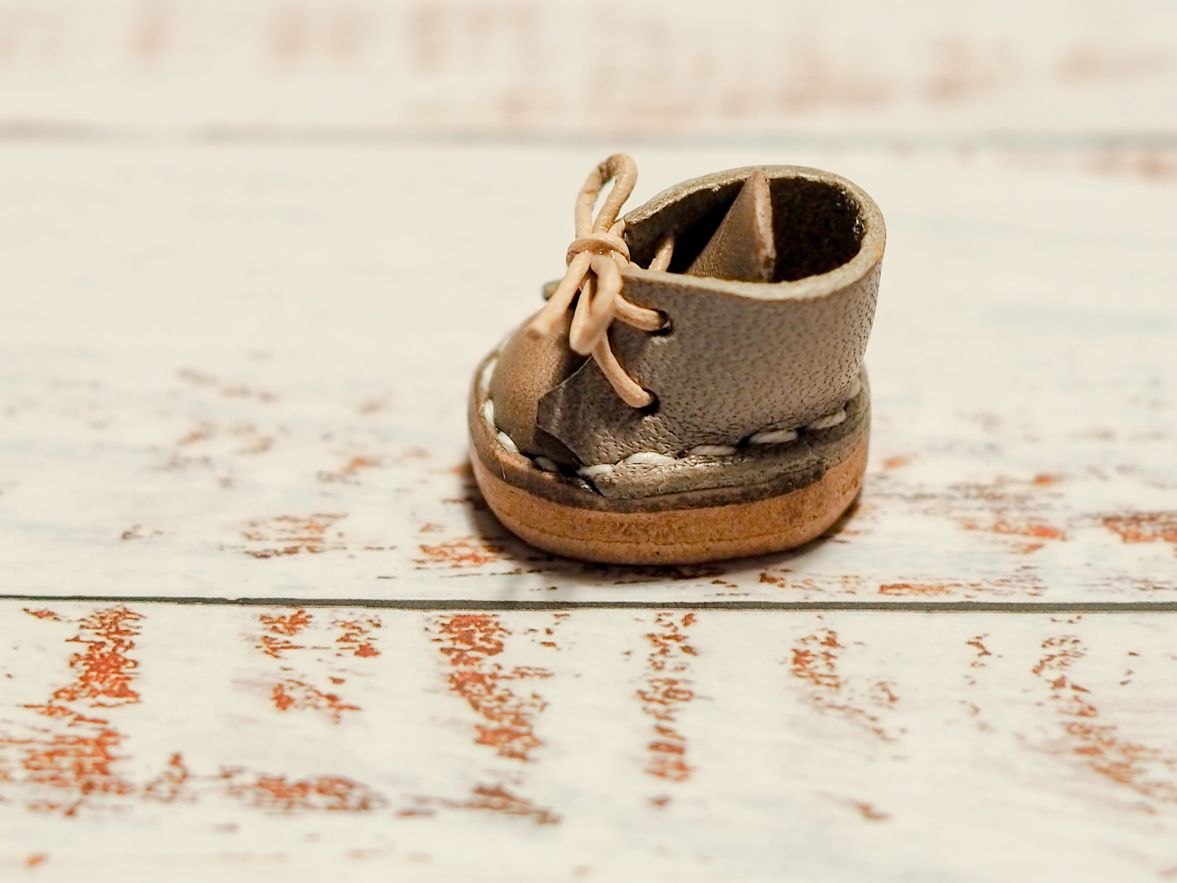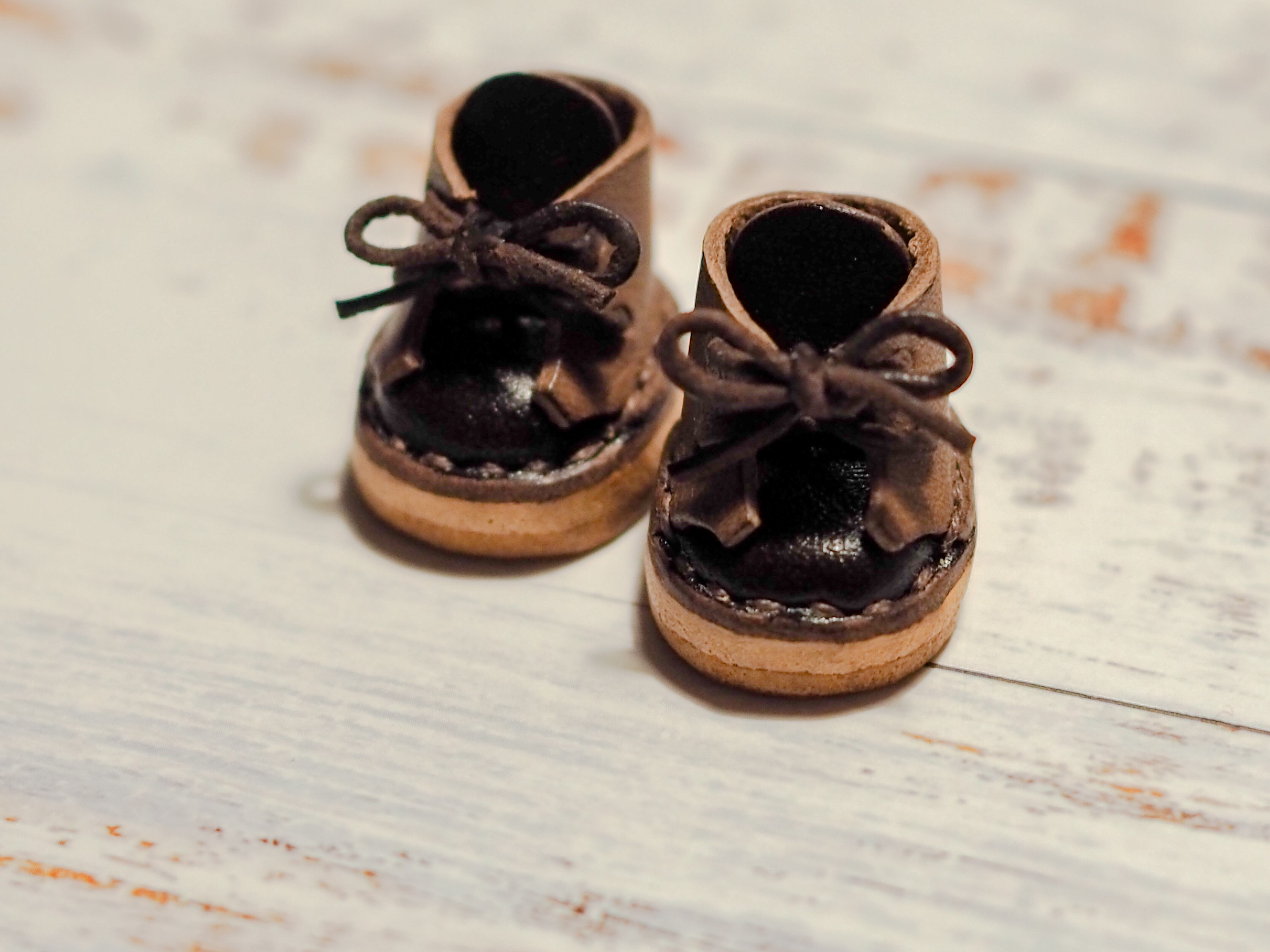 本革にて製作したぬい靴です。試着は10cm~12cmの我が家のぬい達が担当しています。 履いてバランスを取っていただくことで自立のお手伝いをいたします。
