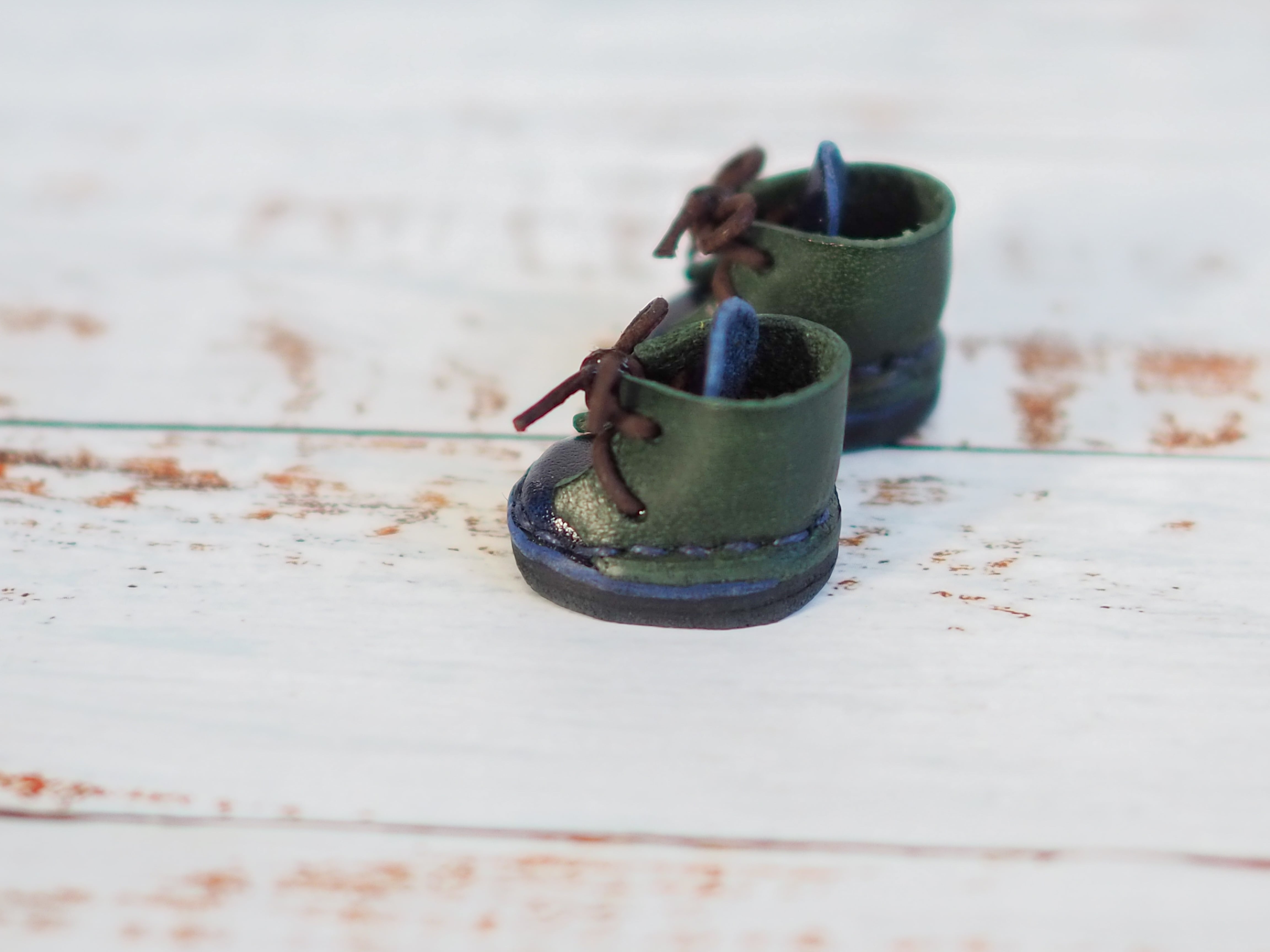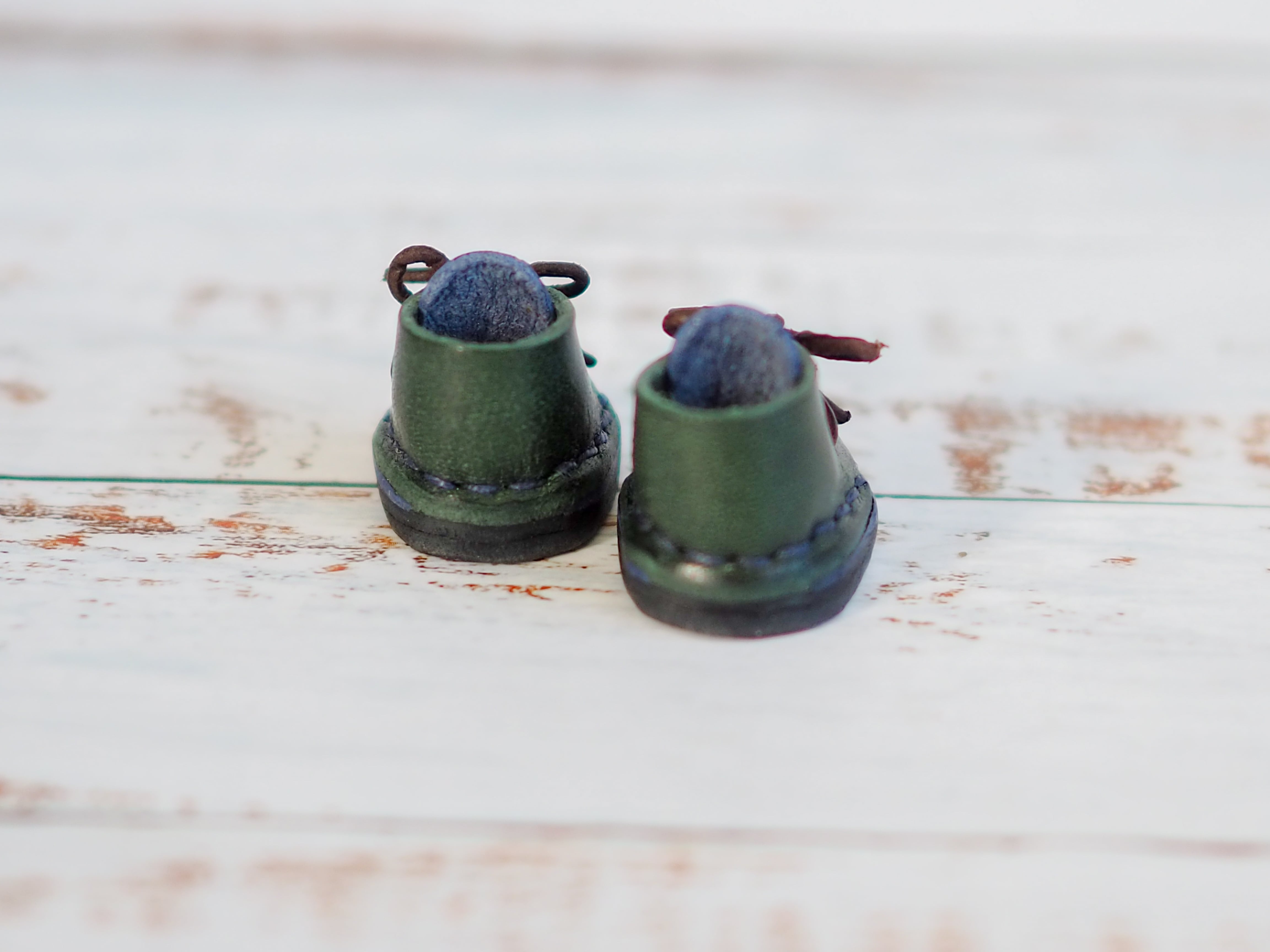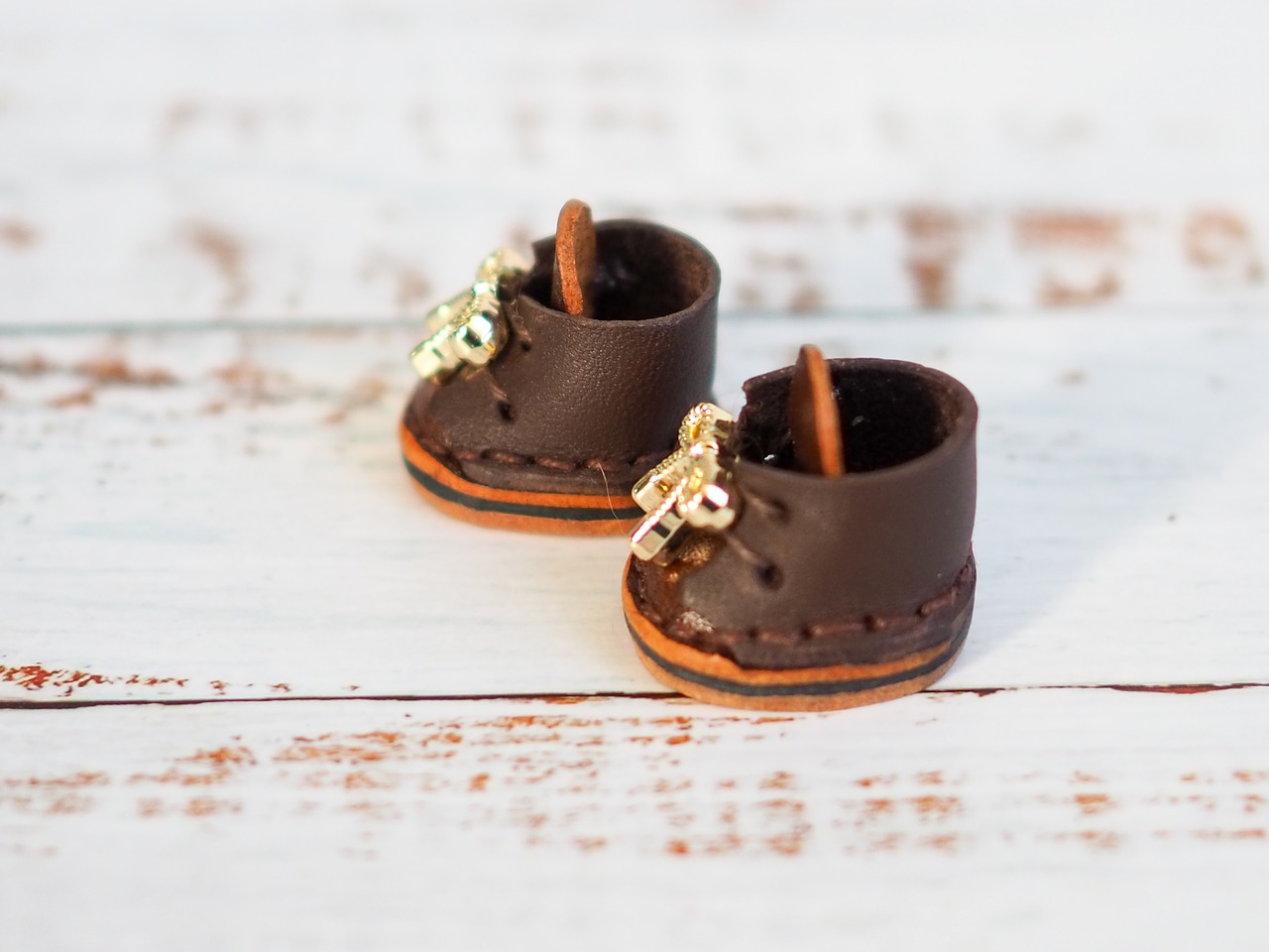 本革にて製作したぬい靴です。試着は10cm~12cmの我が家のぬい達が担当しています。 履いてバランスを取っていただくことで自立のお手伝いをいたします。