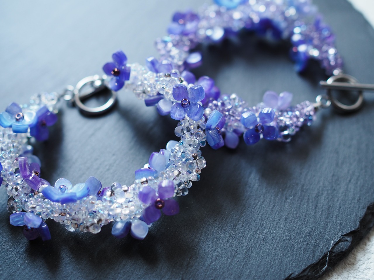 紫陽花をイメージしたブレスレットをビーズで編み上げました。