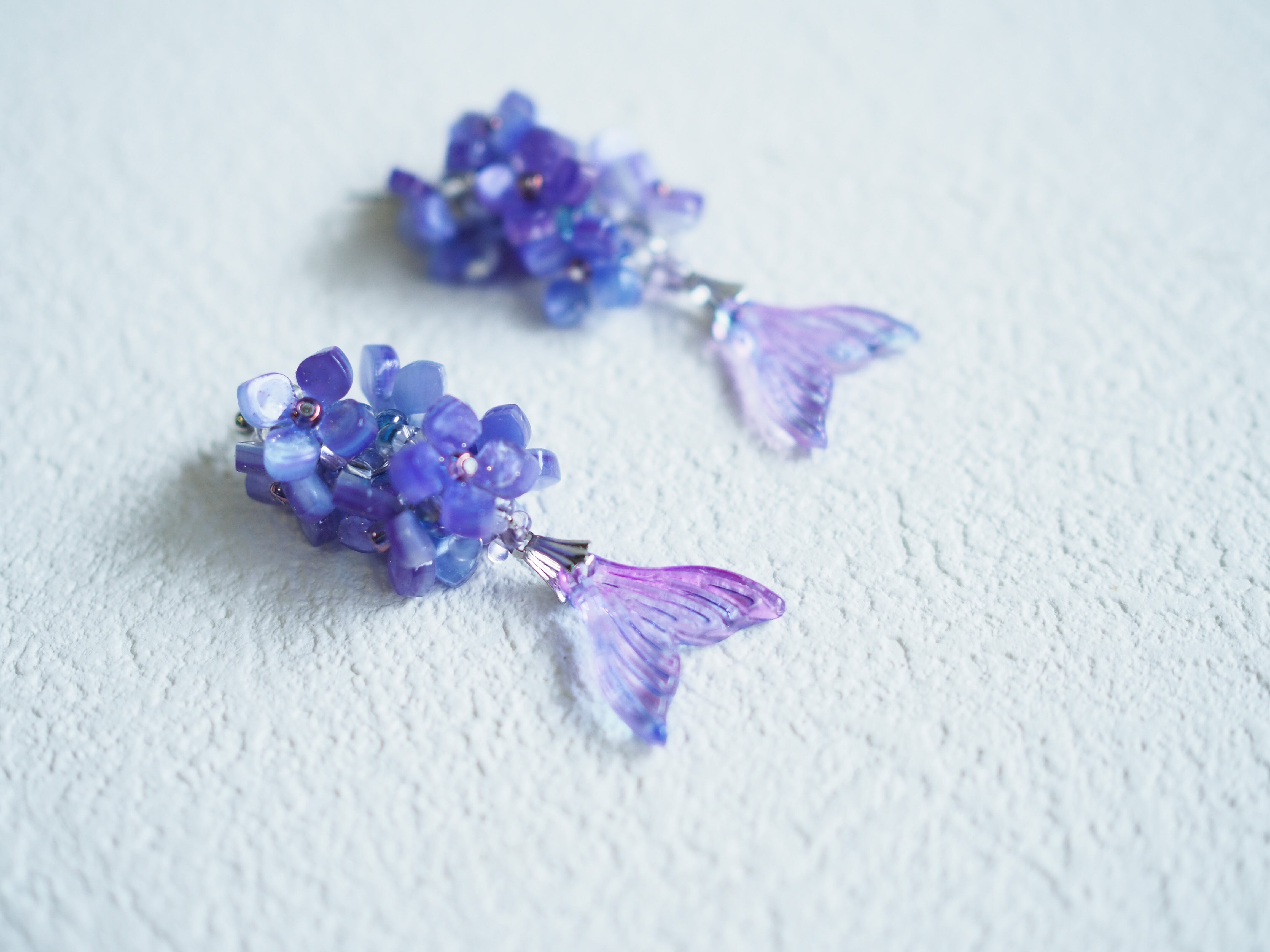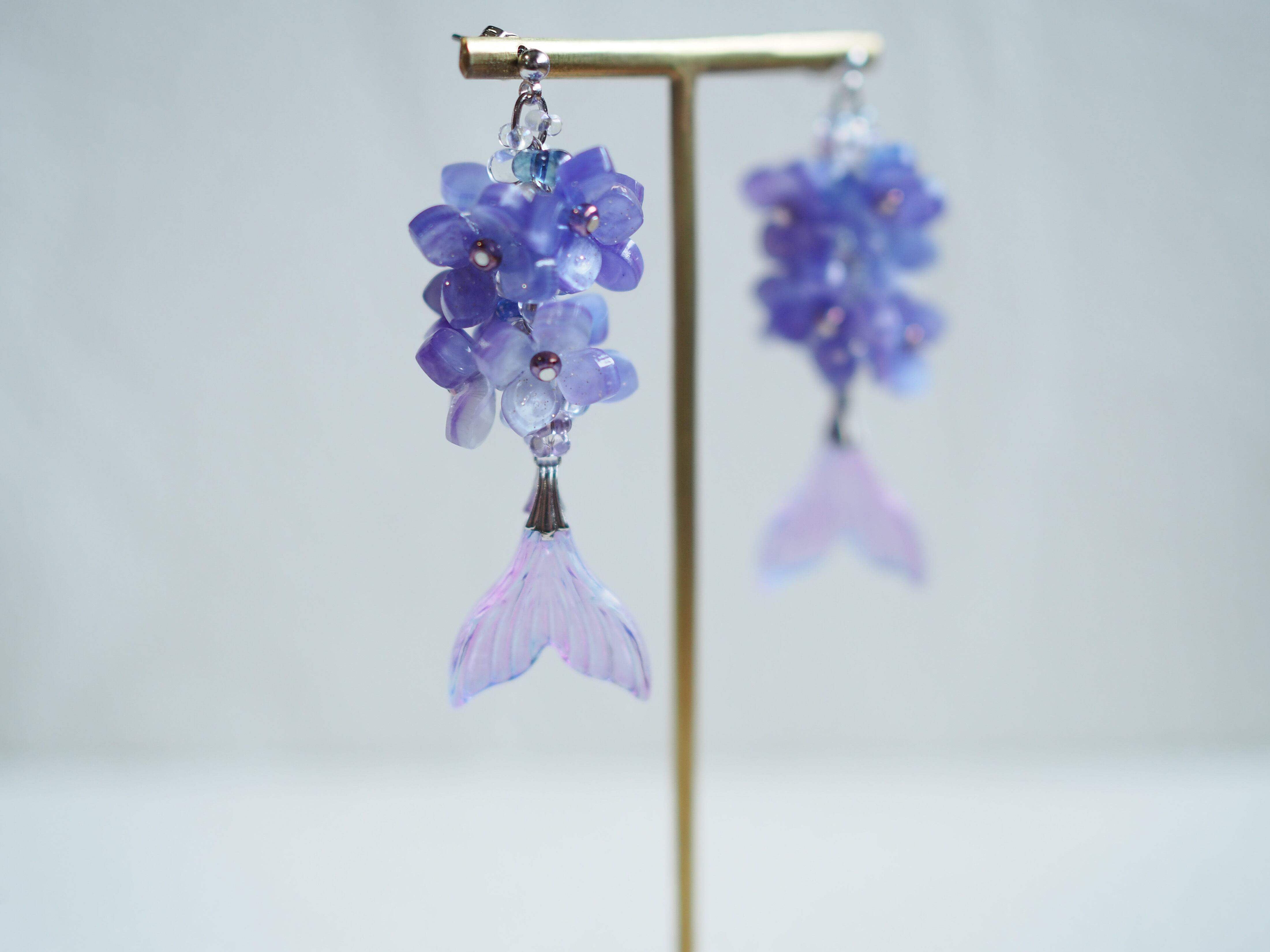 紫陽花を飾った人魚姫をイメージした耳飾りです。金具をネジバネ式イヤリングに変更することが可能です。購入の際にお知らせくださいませ。