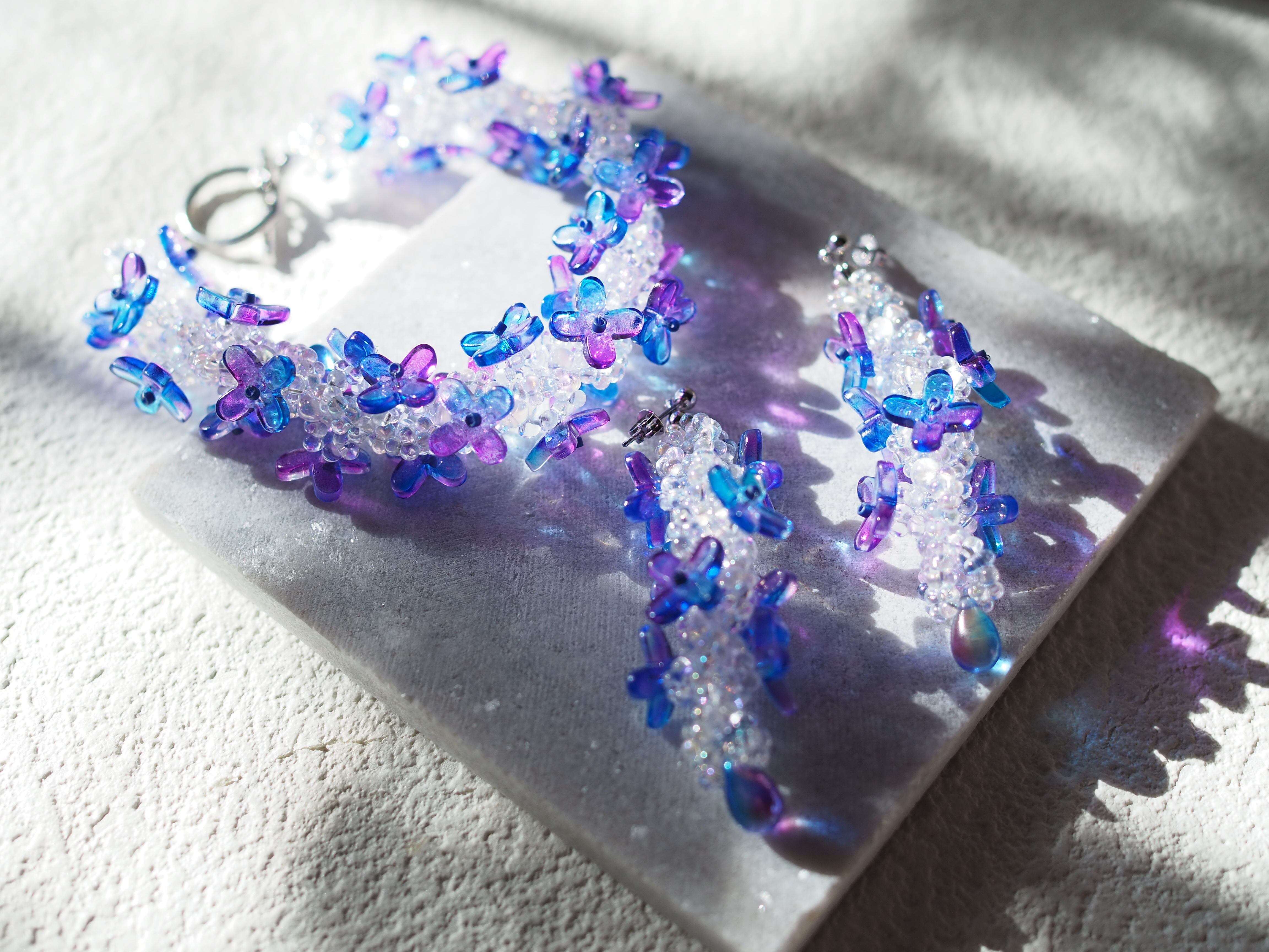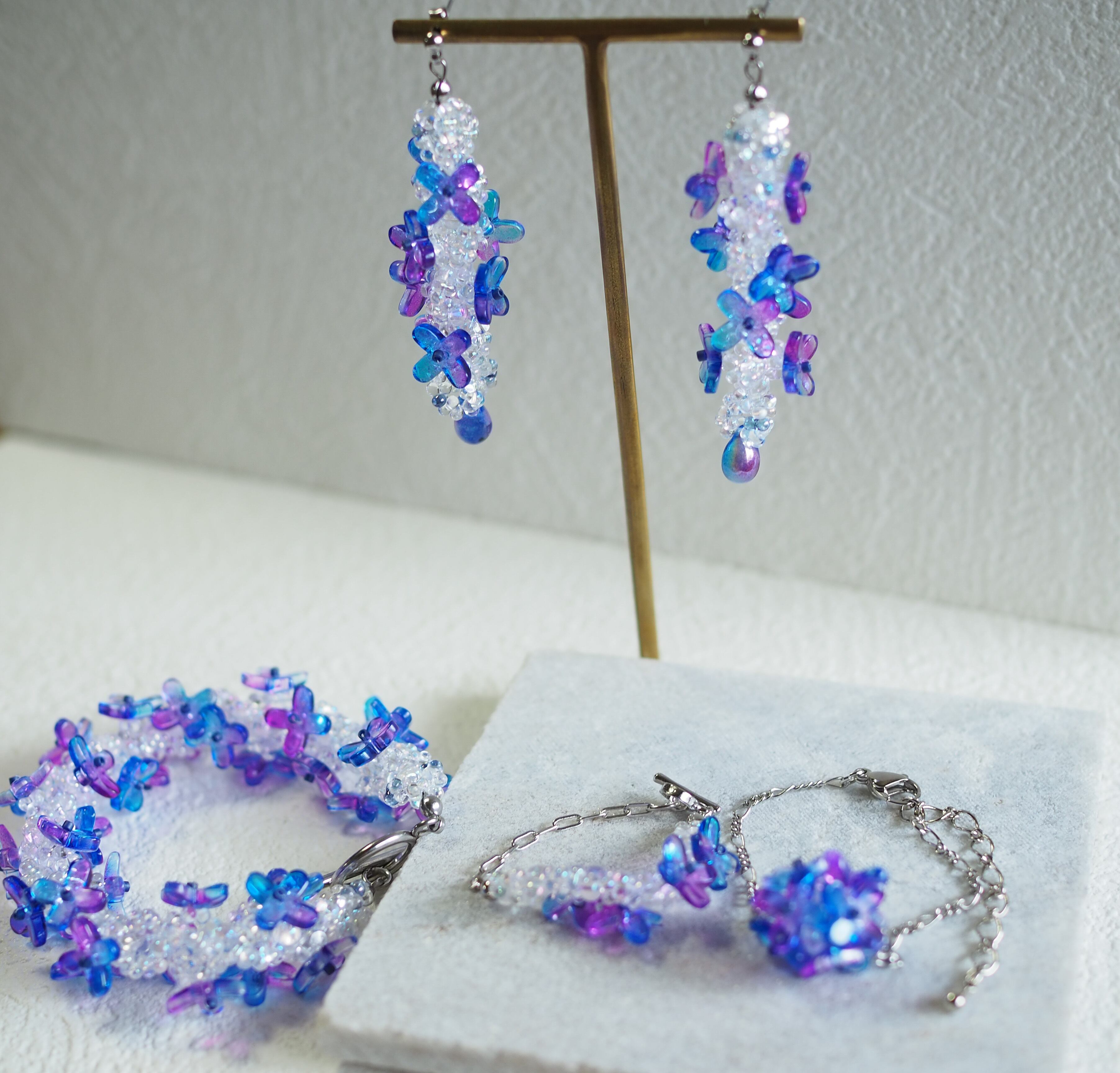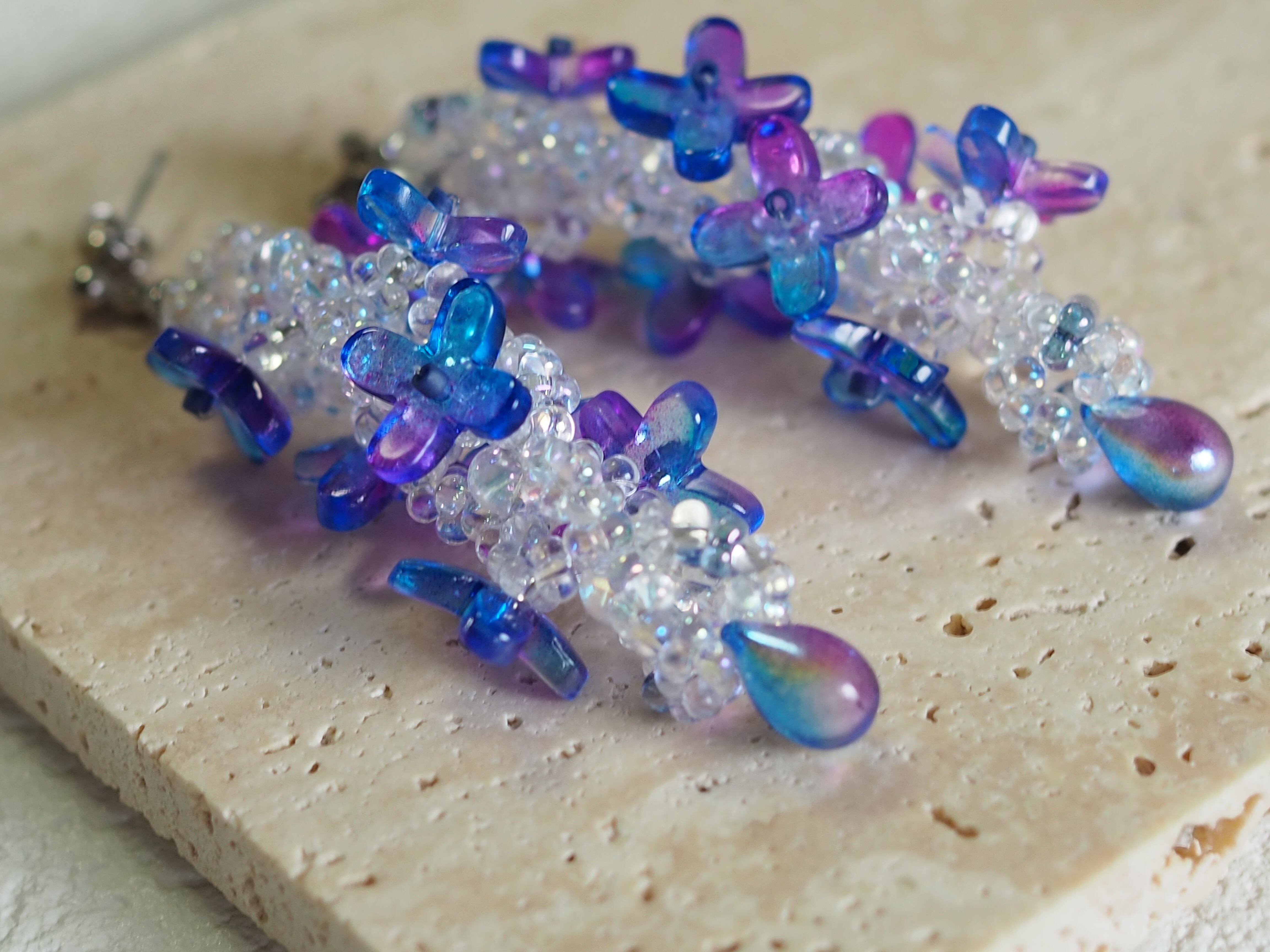 ガラスビーズとテグスで編み上げた透明感が美しい耳飾りです。ほかの透明紫陽花シリーズとおそろいで身に付けて楽しんでいただくことが可能です。