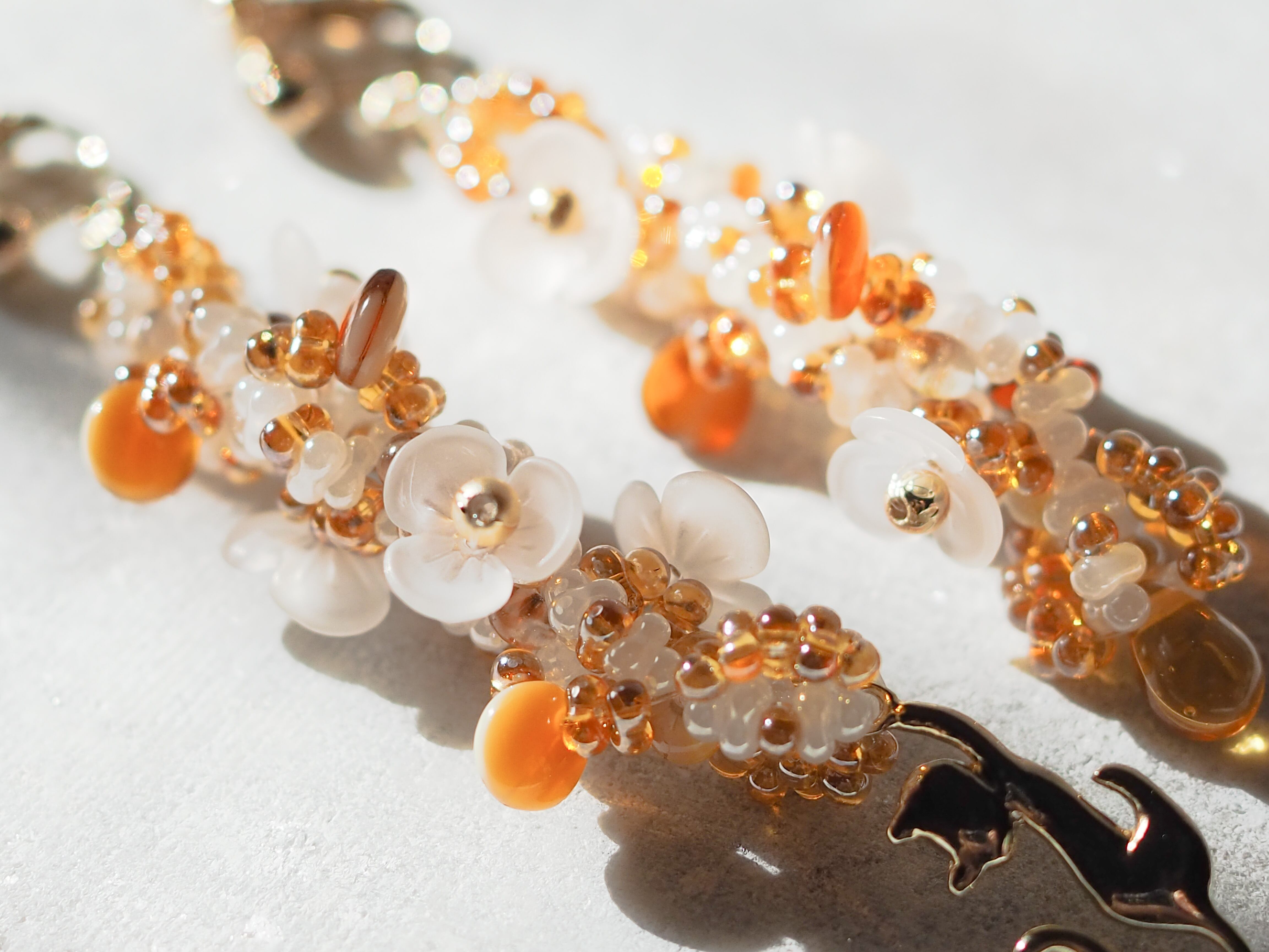 チェコのガラスビーズと猫のモチーフ、そして花のパーツをテグスで丁寧に編み上げて耳飾りを作りました。円盤型のビーズがパンケーキのような甘くて愛しい色合いです。(金具はゴールドで制作いたします)