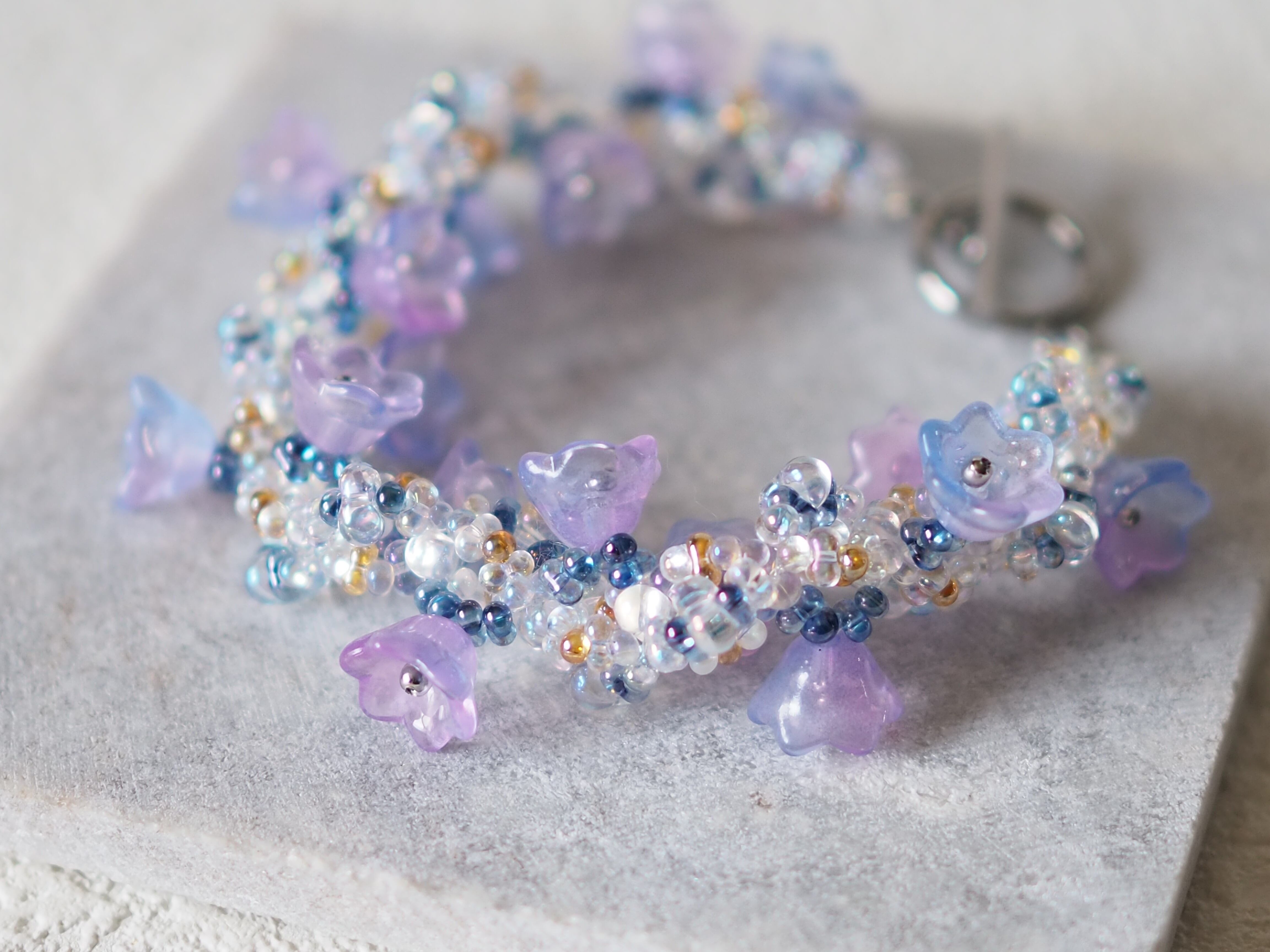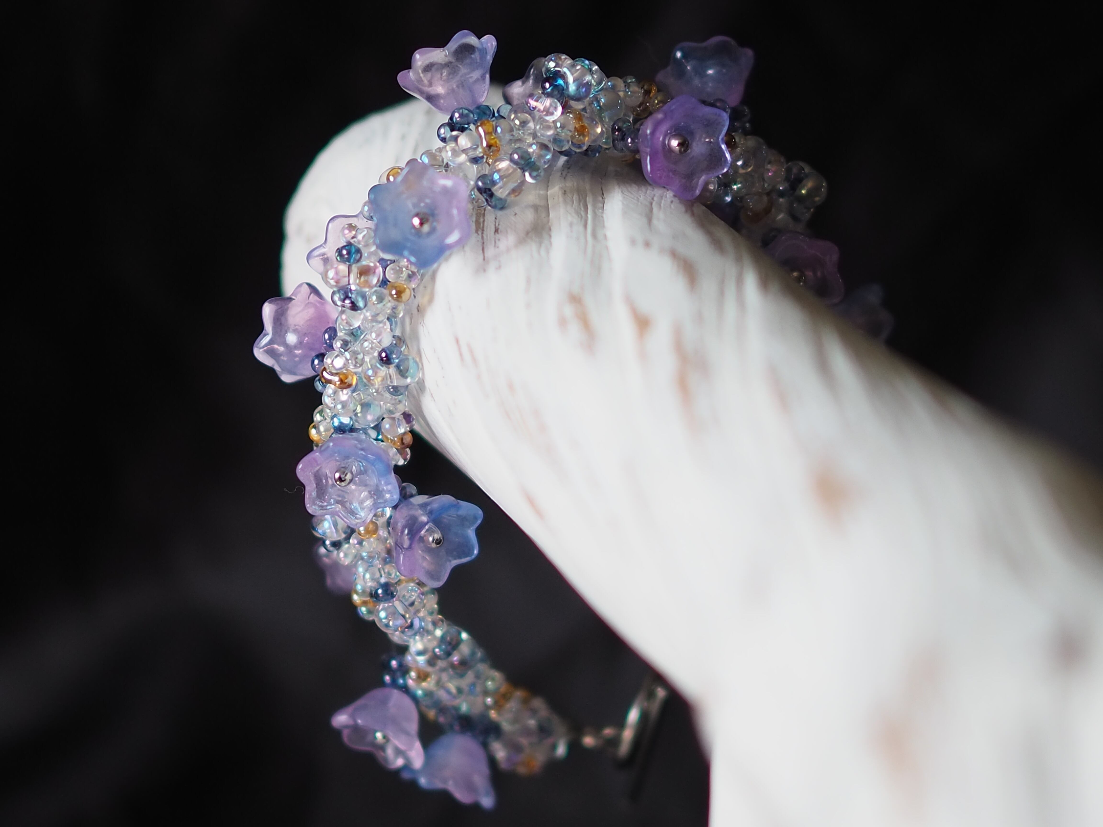 チェコのガラスビーズを使用し、透明感のあるブレスレットを編み上げました。そこへ魔法の夜のイメージのグラデーションカラーが美しいガラスフラワーを編み込みました。