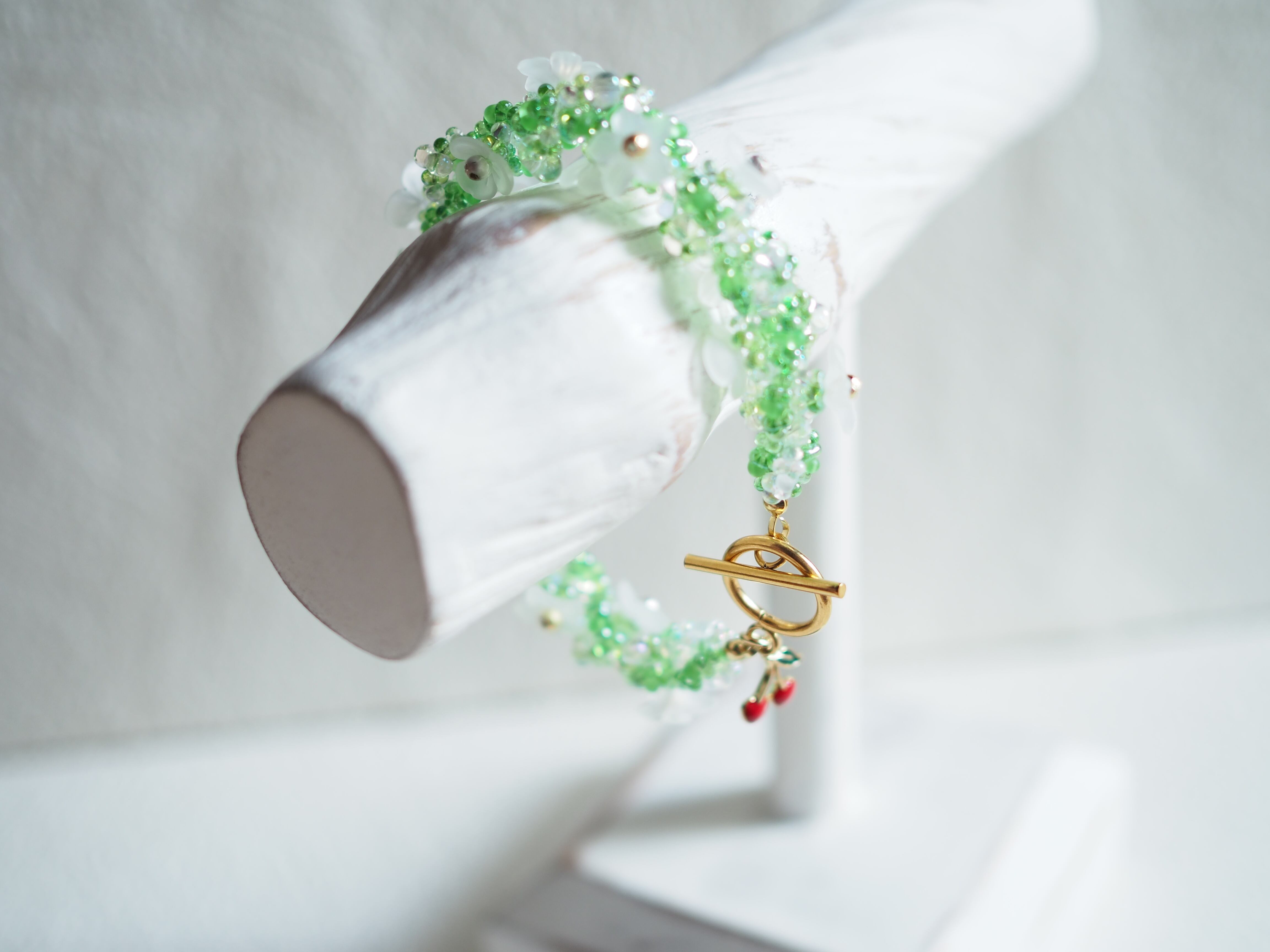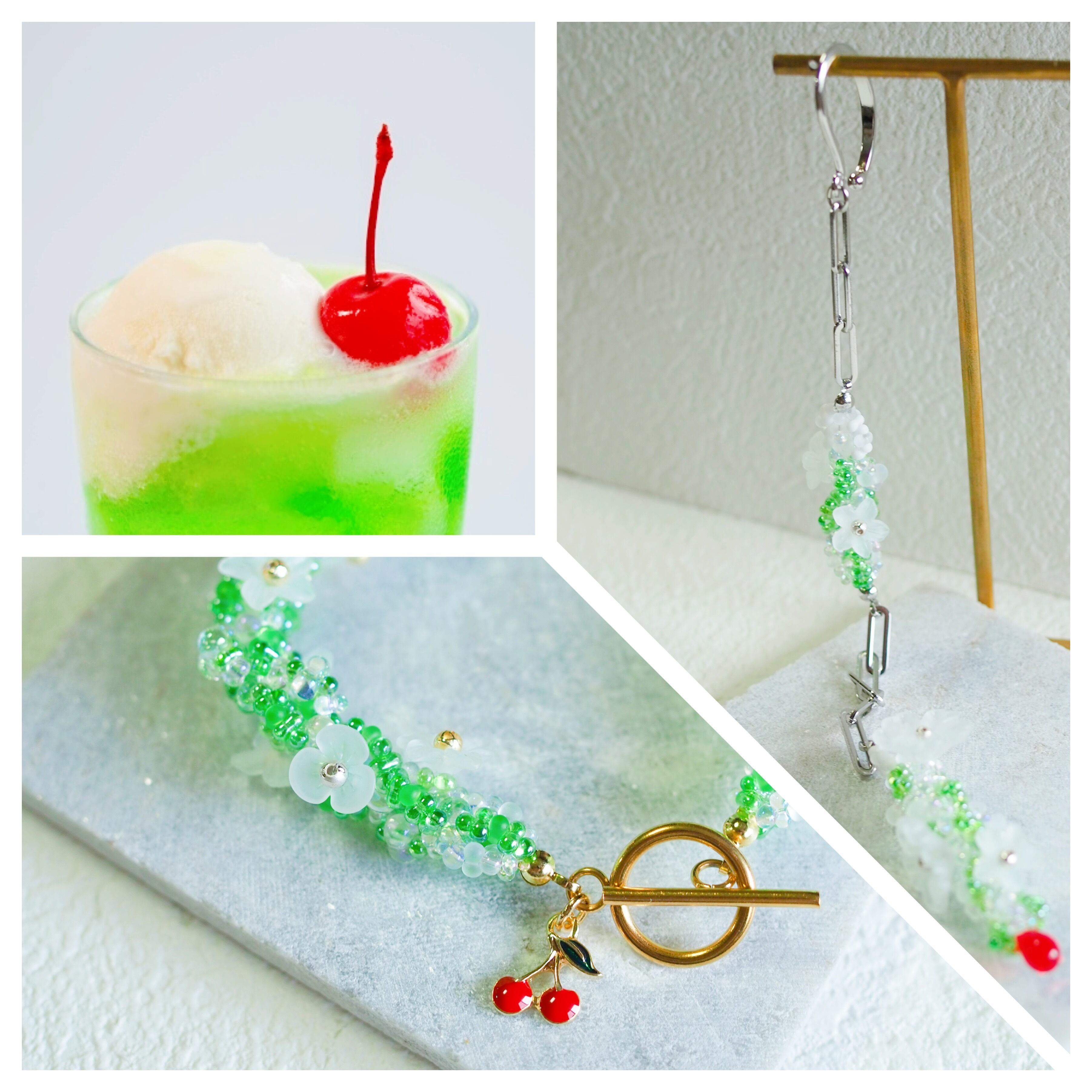 チェコのガラスビーズを使用し、透明感のあるブレスレットを編み上げました。クリームソーダをイメージしてブレスレットを編み、ポイントでチェリーのチャームを飾っています。金具はサージカルステンレス製の変色や錆に強い物を使用しています。