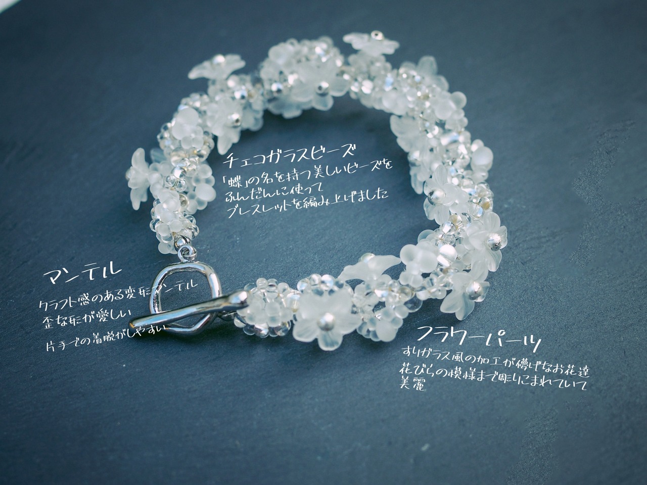 身に付けて力をもらえる力強さと可憐さと美しさ。そんなたくさんの言葉をイメージして編み上げたブレスレットです。ぜひ、あなたの腕に、花を咲かせてみてください。