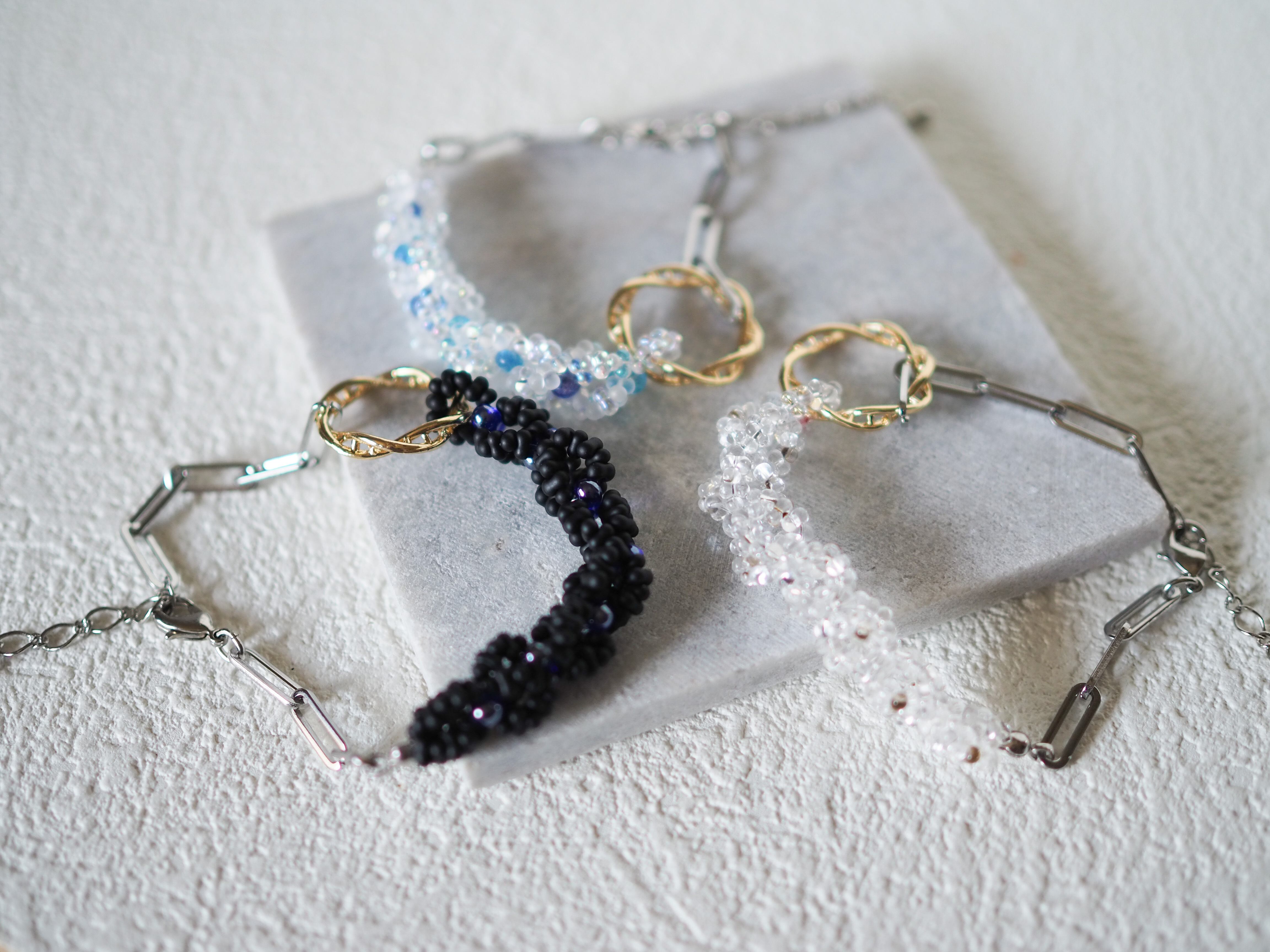 透明なビーズの中にゴールドラインのビーズをさりげなく編み込んだ、Luxe