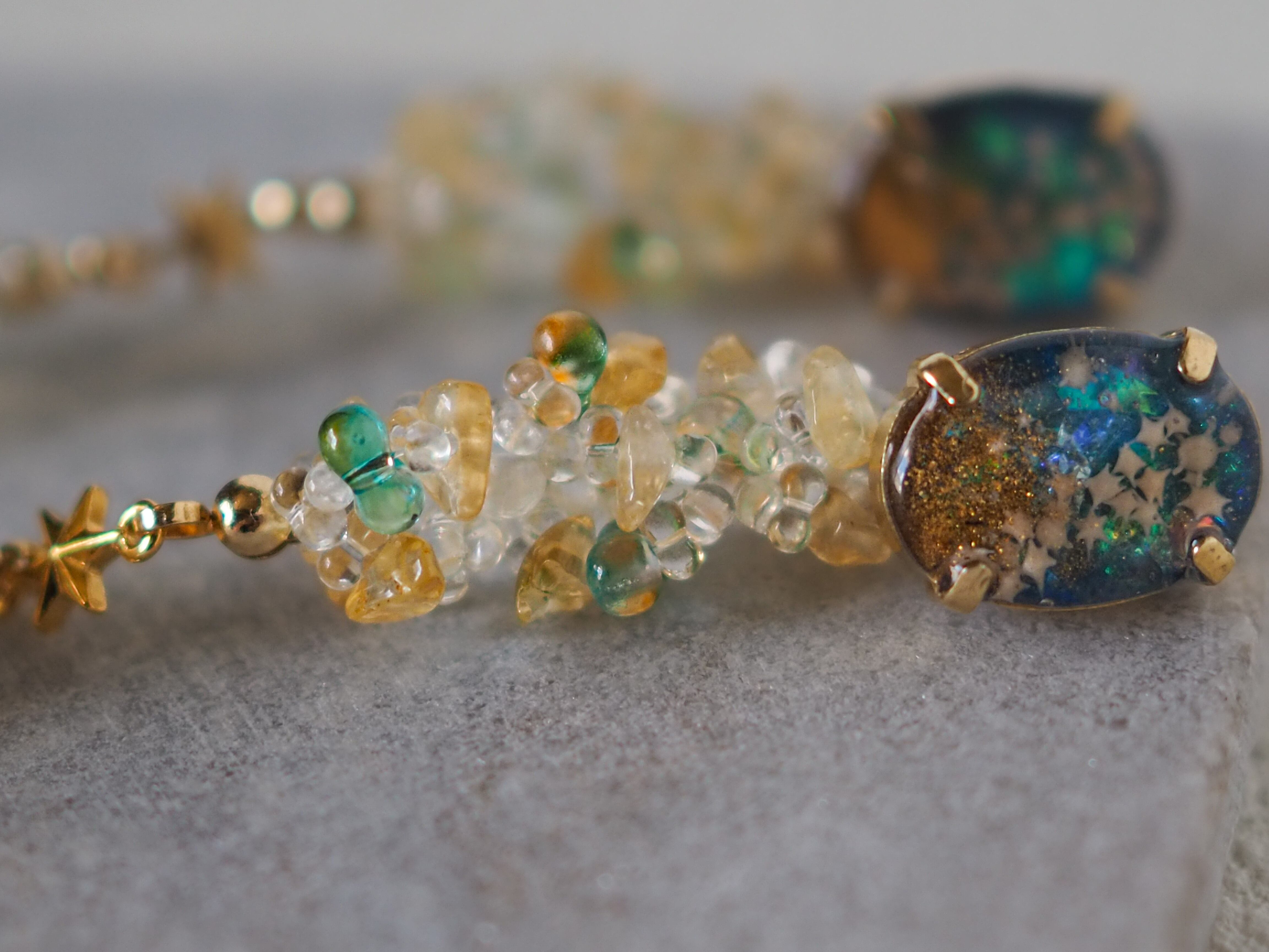 UVレジン、石座(銅亜鉛合金)、ピアスパーツ(真鍮)、金具(真鍮)、メタルパーツ(亜鉛合金)、ガラスビーズ、天然石(シトリン)