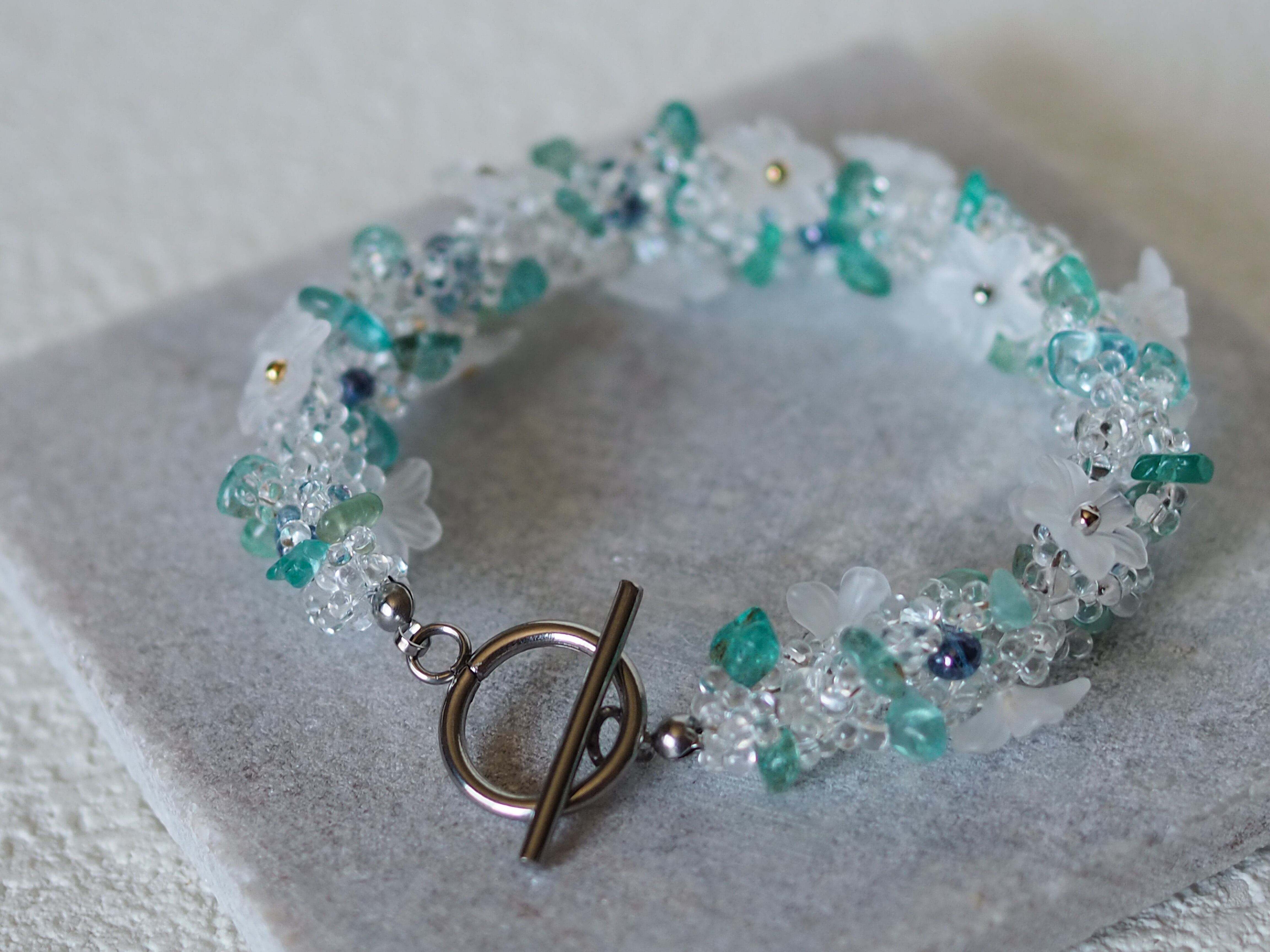 天然のパワーストーン、アパタイトを使用し、ガラスビーズと組み合わせて編み上げたブレスレットです。