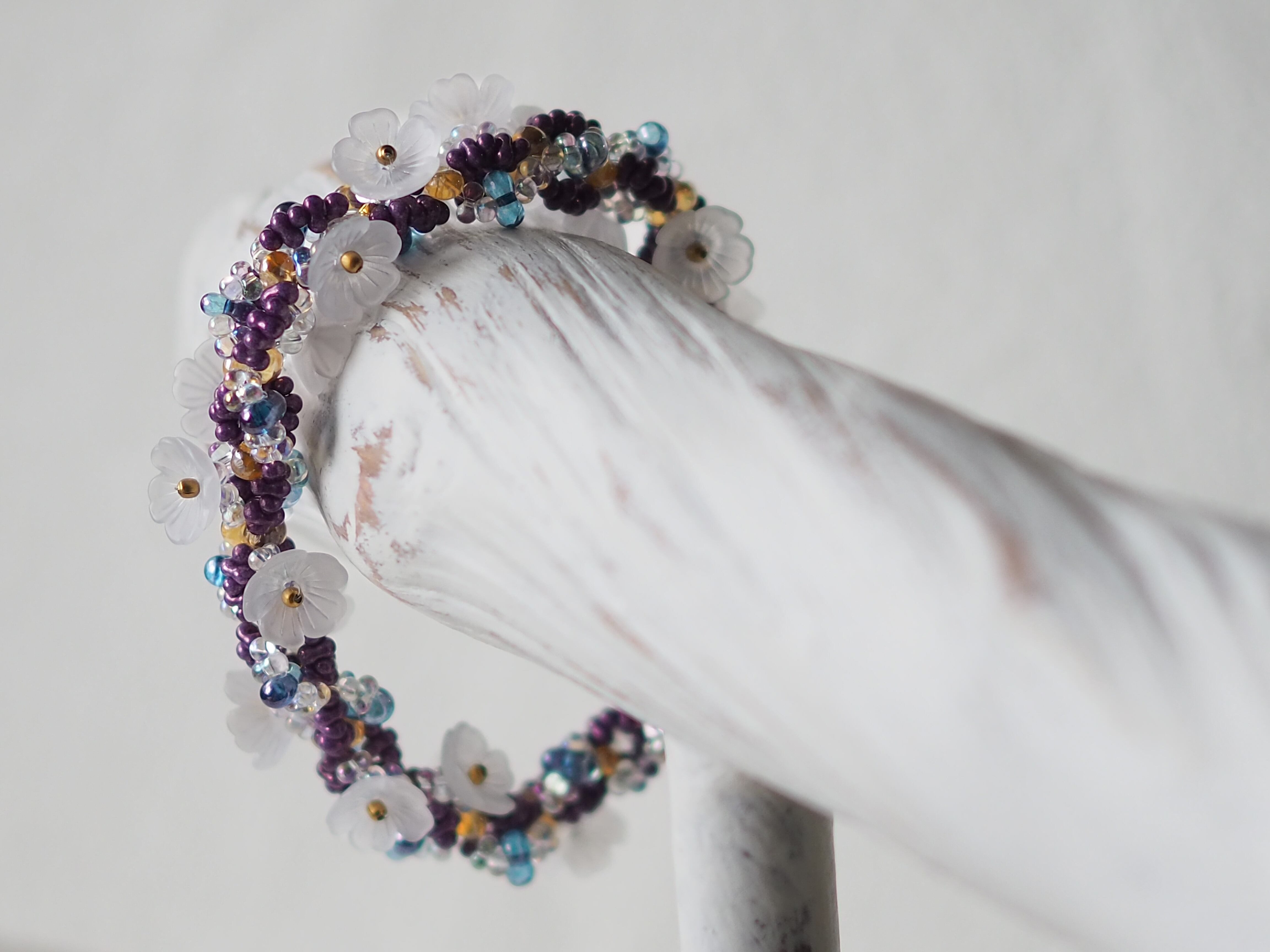 ビーズをひとつひとつ通し、お花をひとつひとつ編み込み大切に作り上げたブレスレットはプレゼントにもおすすめです。