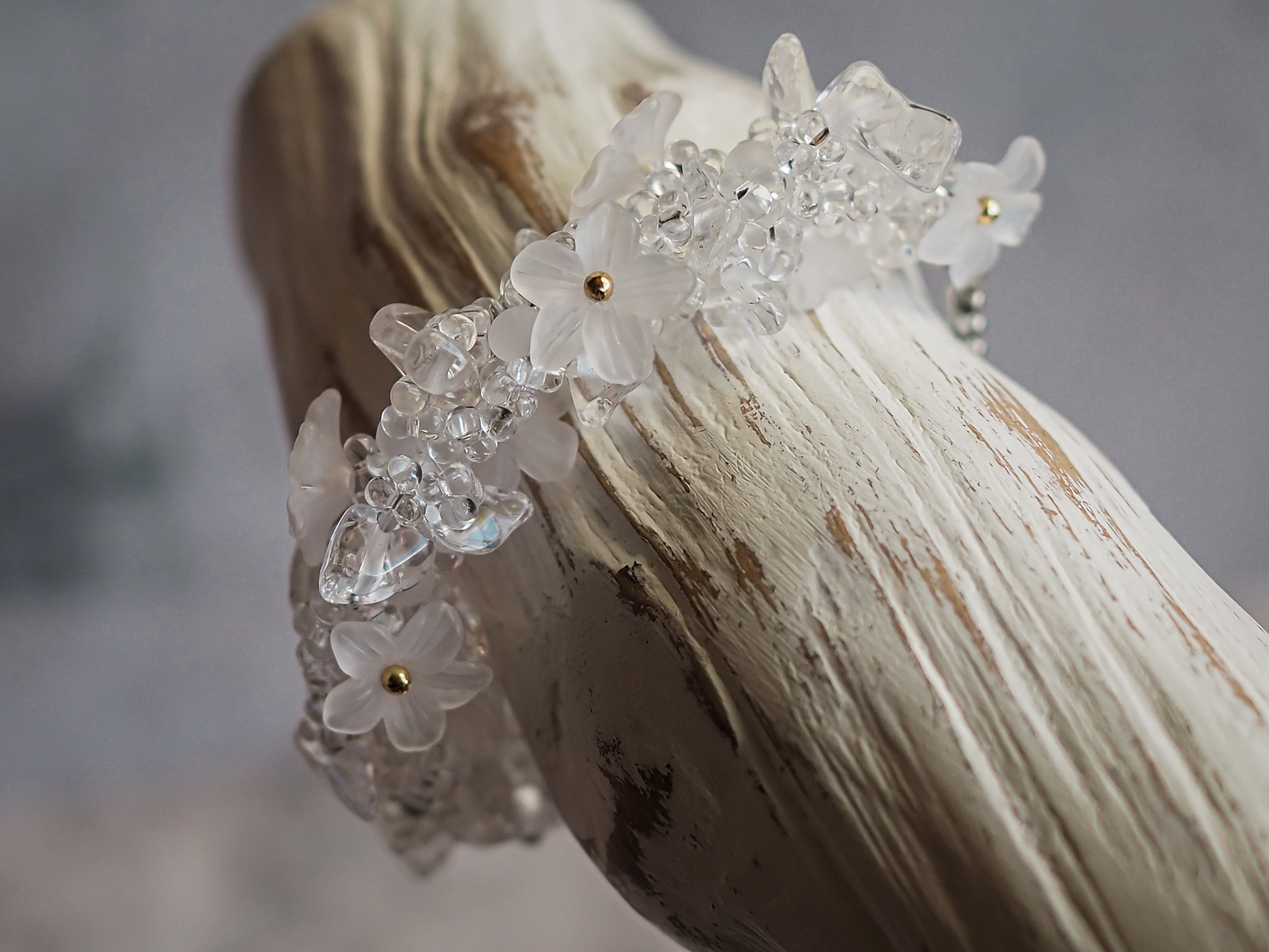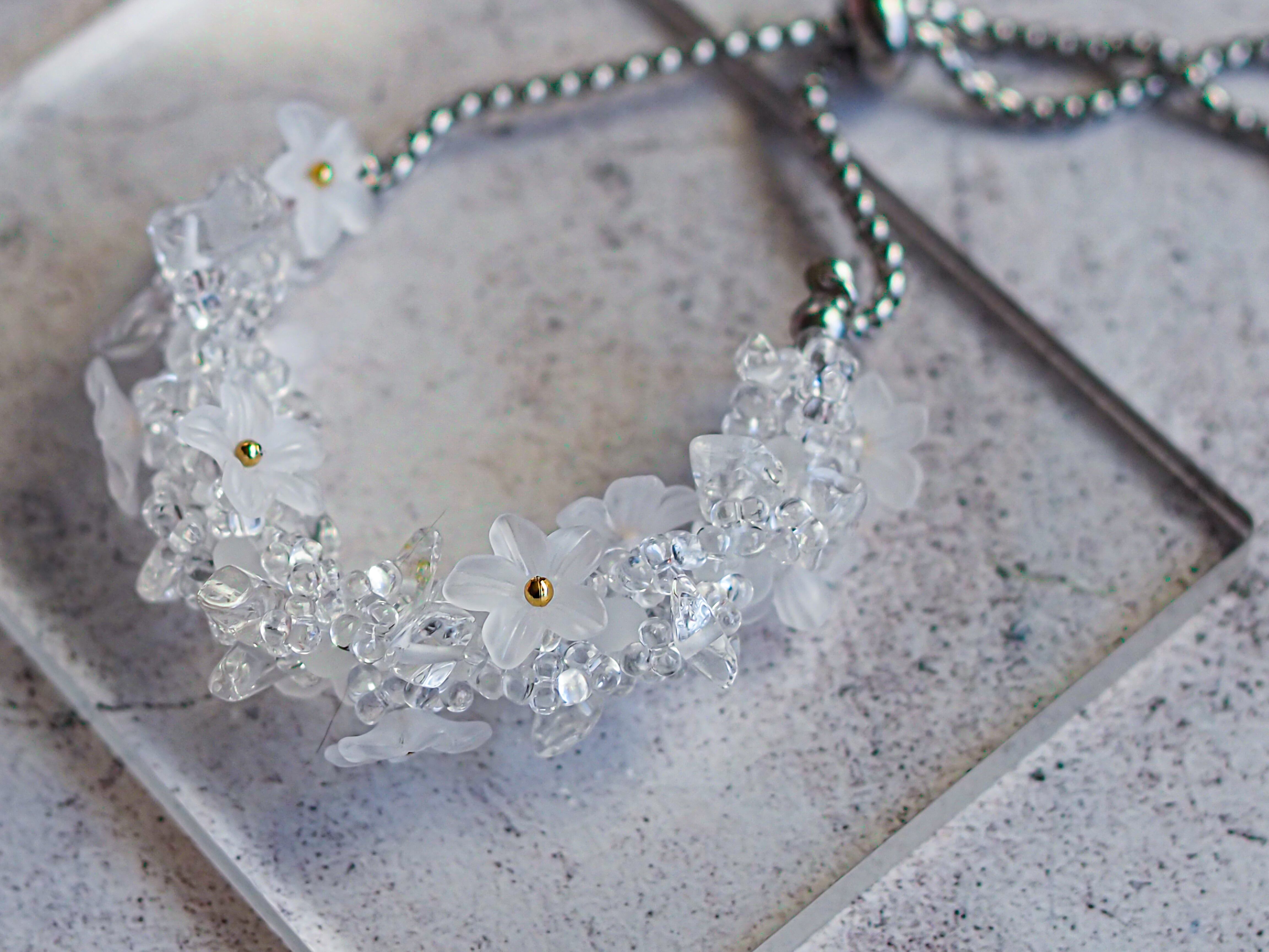 チェコガラスビーズと磨りガラスのような風合いのアクリル花パーツをテグスで丁寧に編み上げたブレスレットです。どんな装いにも合わせやすく、手首に花を飾れます。