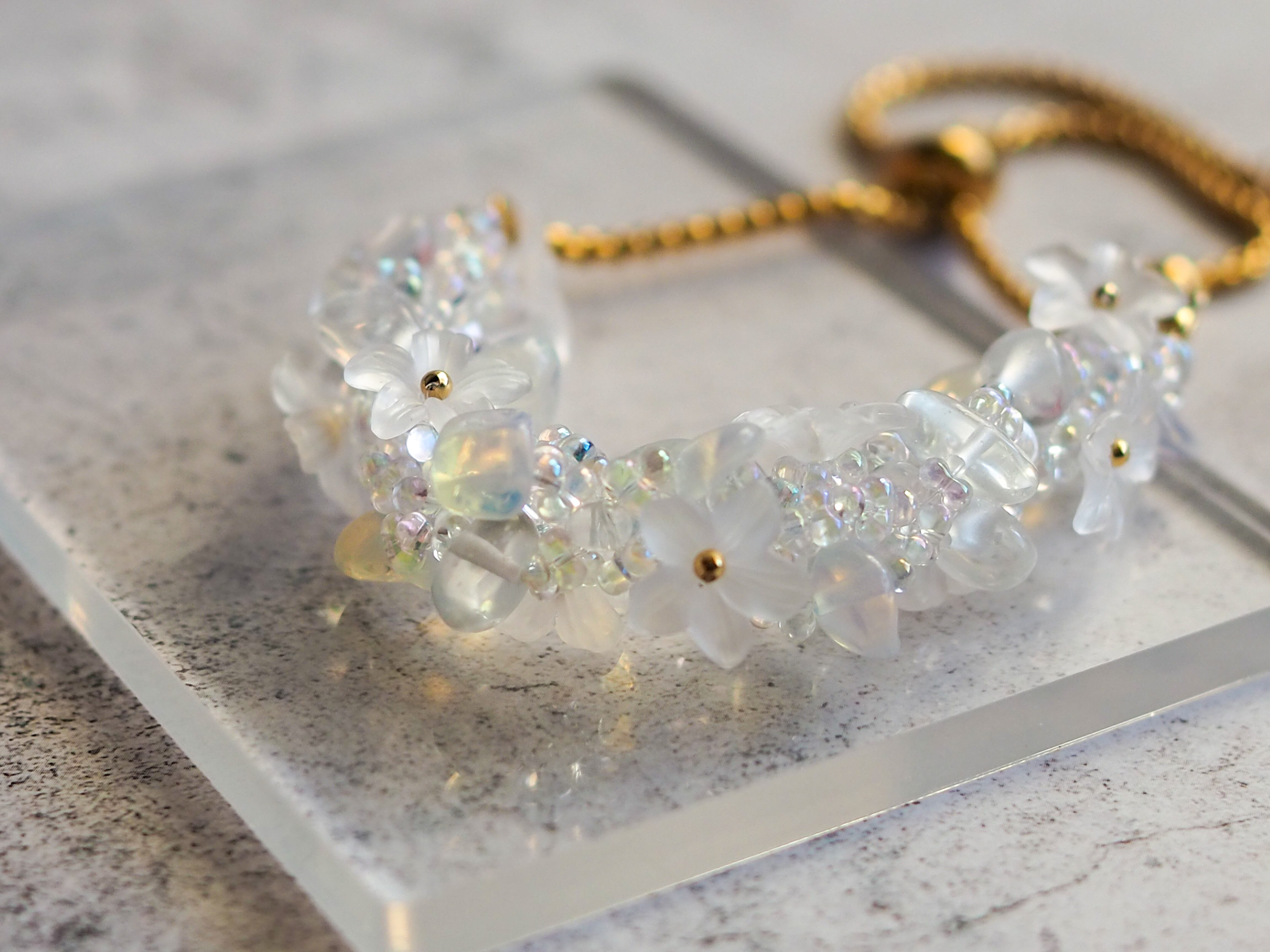 チェコガラスビーズと磨りガラスのような風合いのアクリル花パーツをテグスで丁寧に編み上げたブレスレットです。どんな装いにも合わせやすく、手首に花を飾れます。