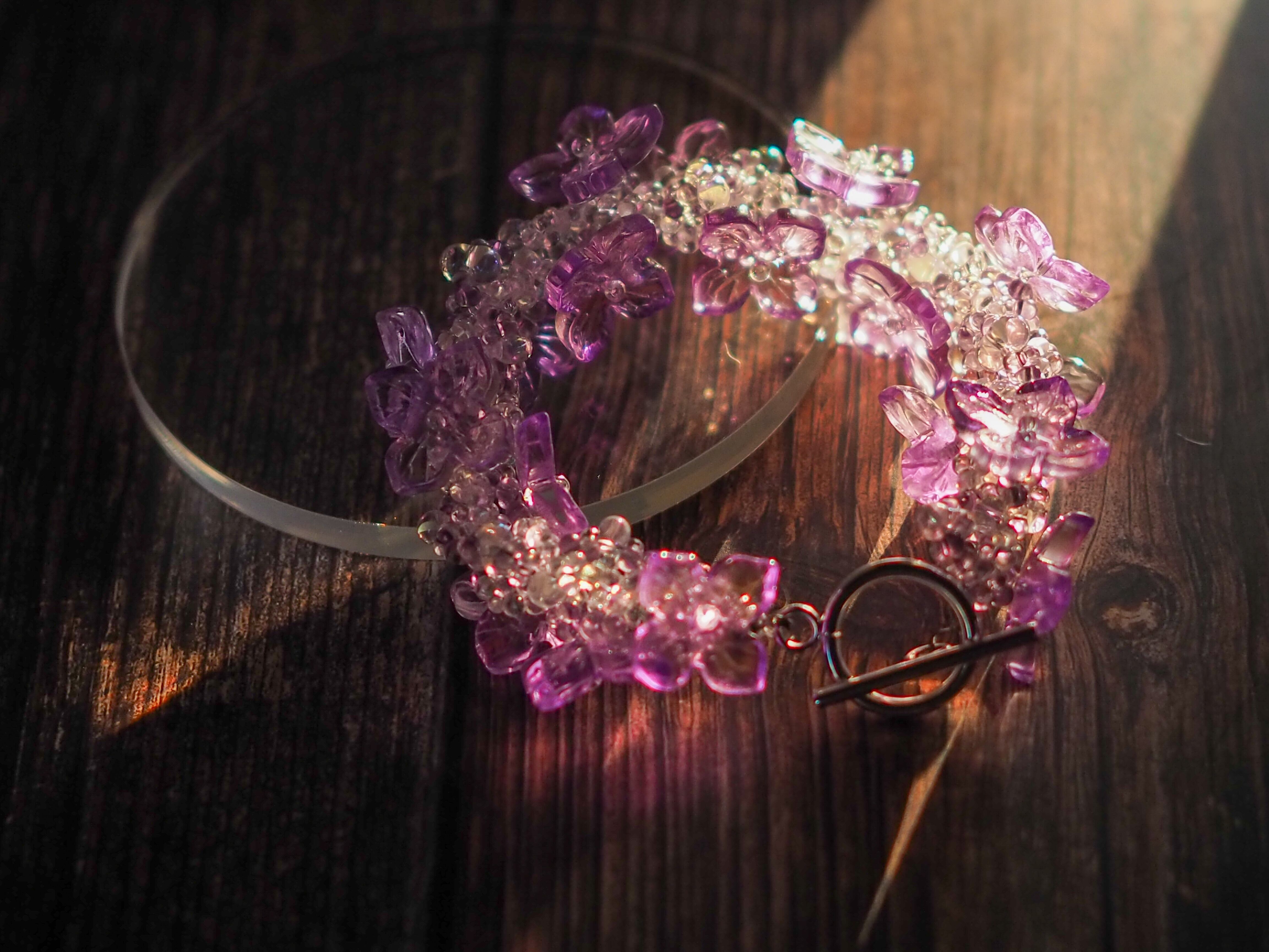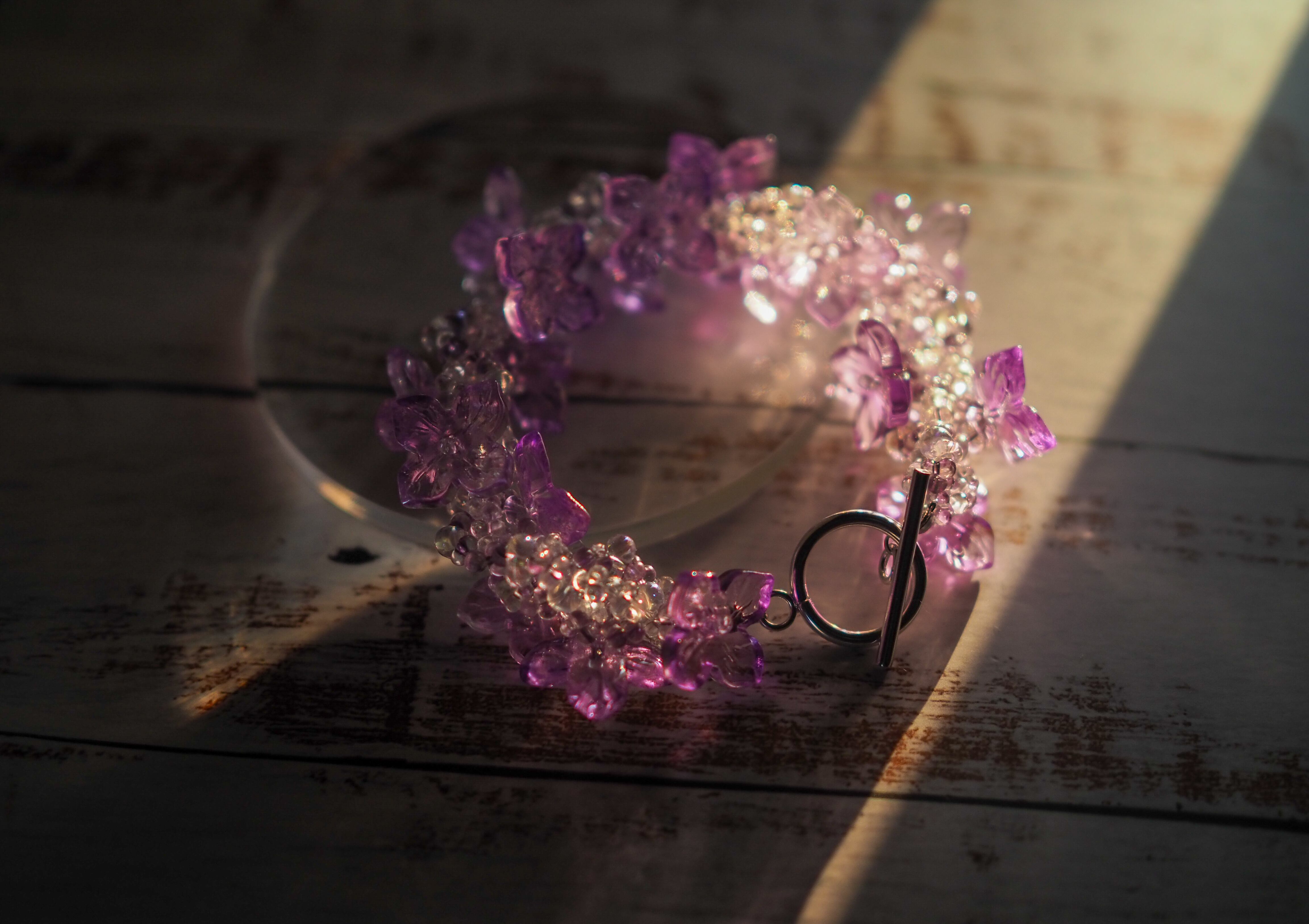 紫陽花をイメージし、ガラスのお花パーツ、ガラスビーズでブレスレットを編み上げました。