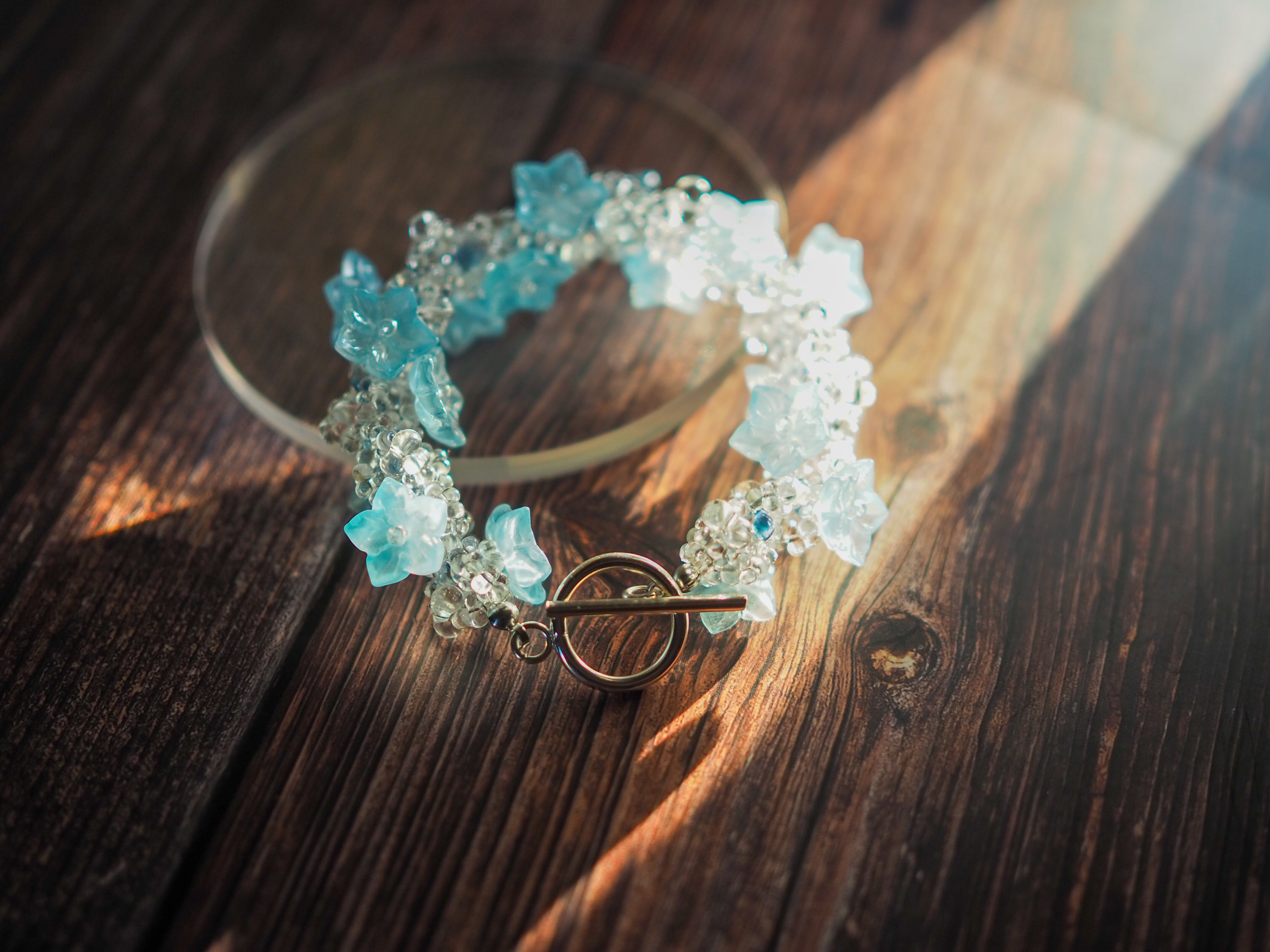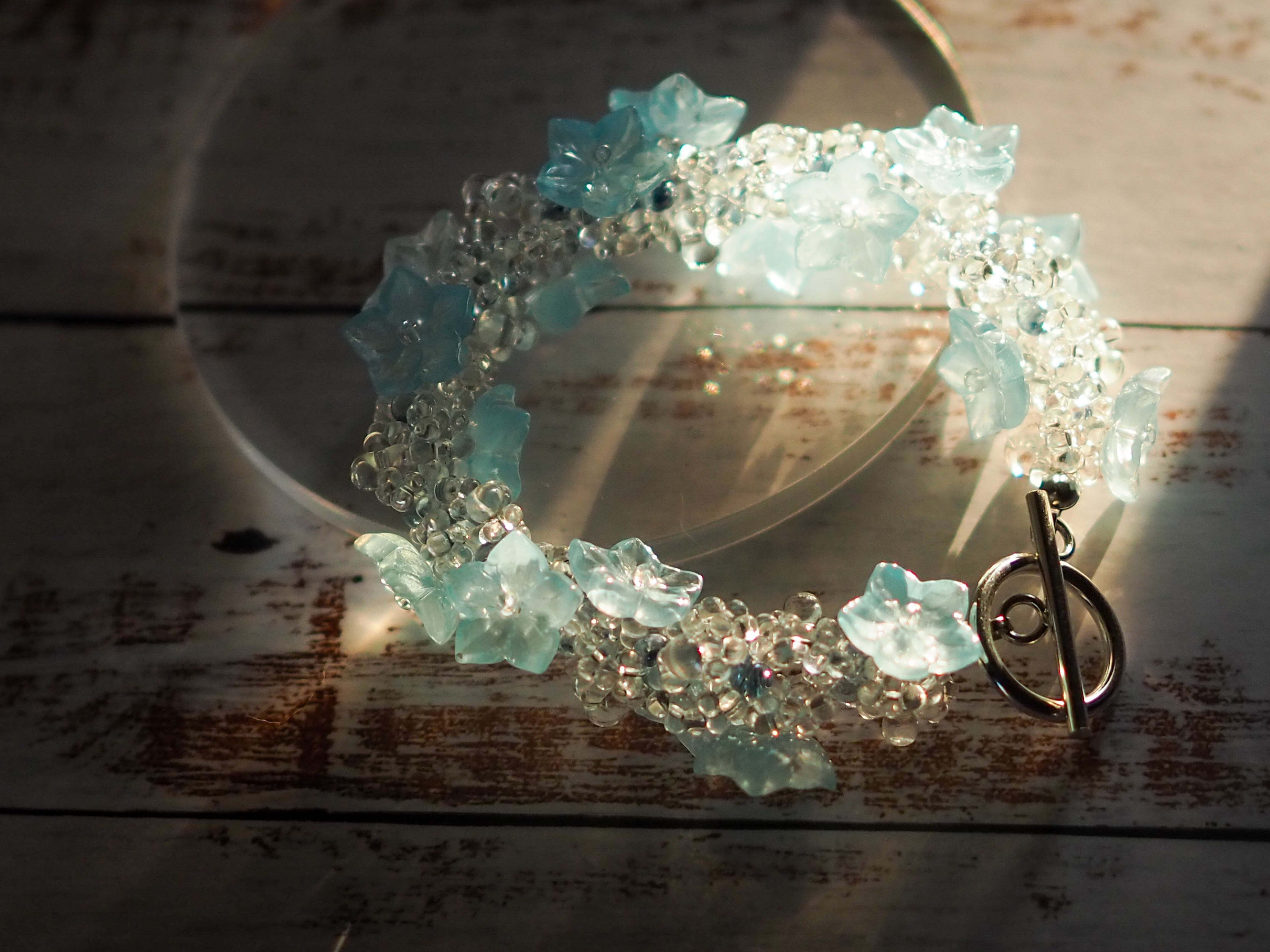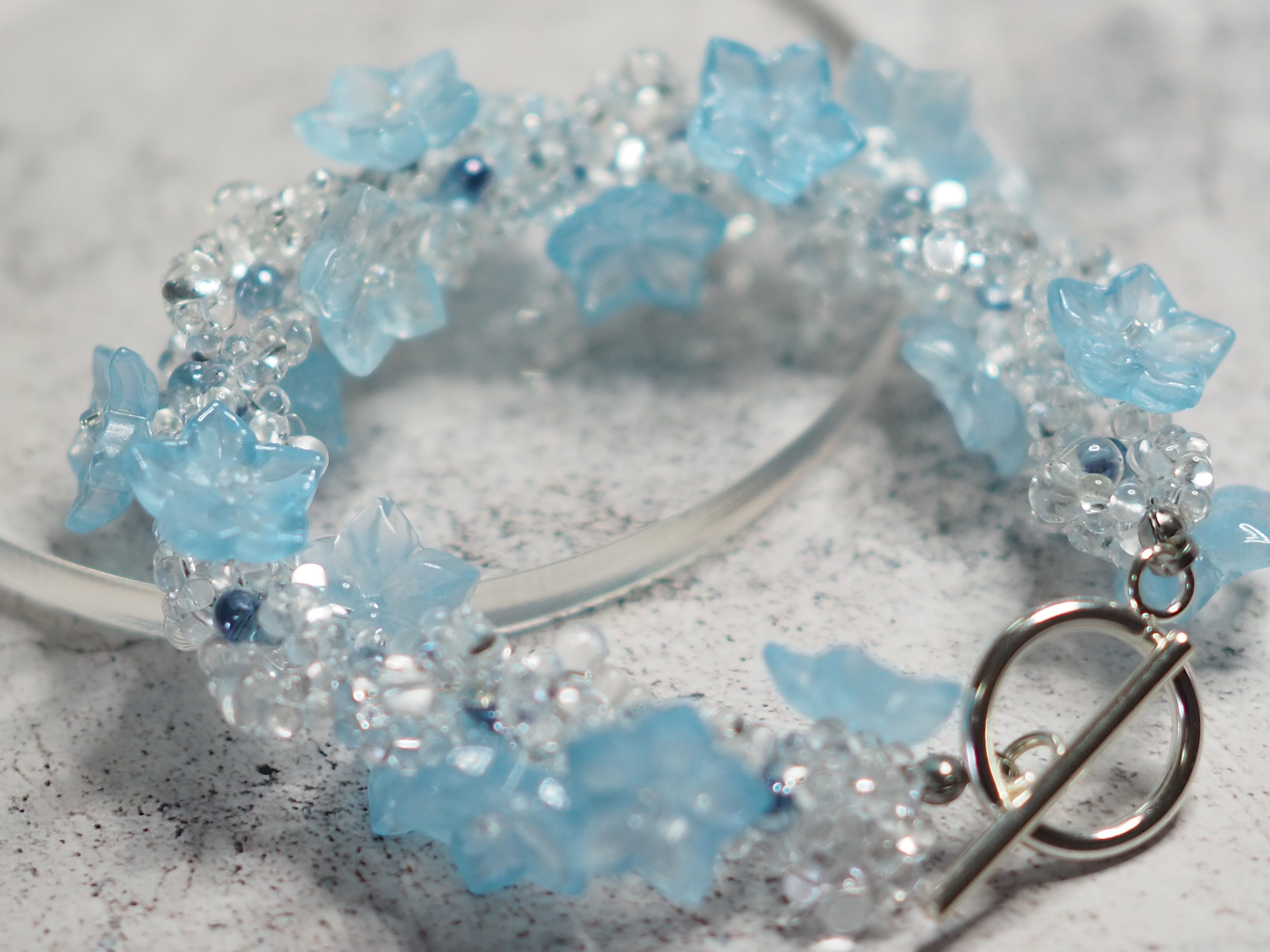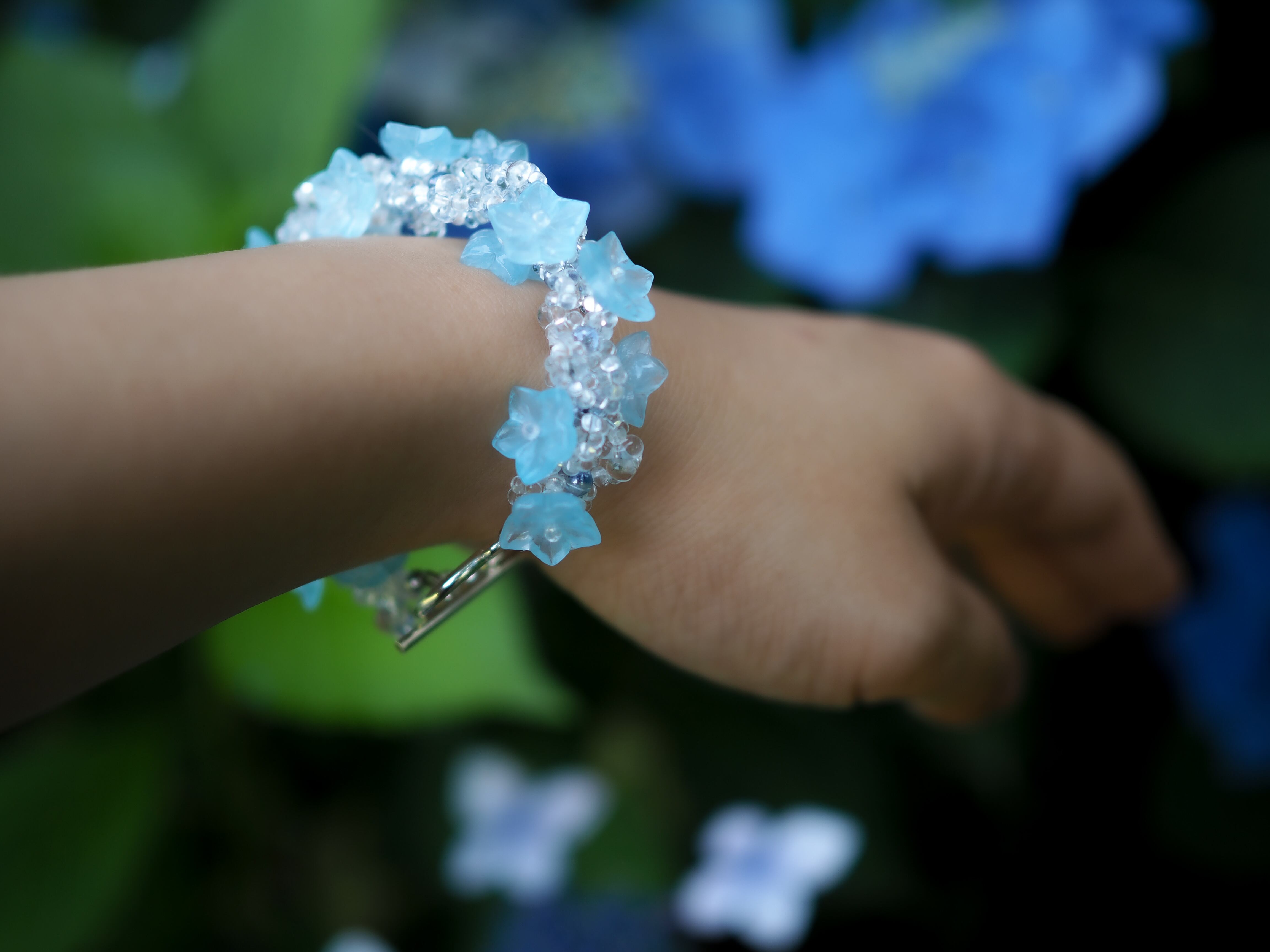 紫陽花をイメージし、ガラスのお花パーツ、ガラスビーズでブレスレットを編み上げました。