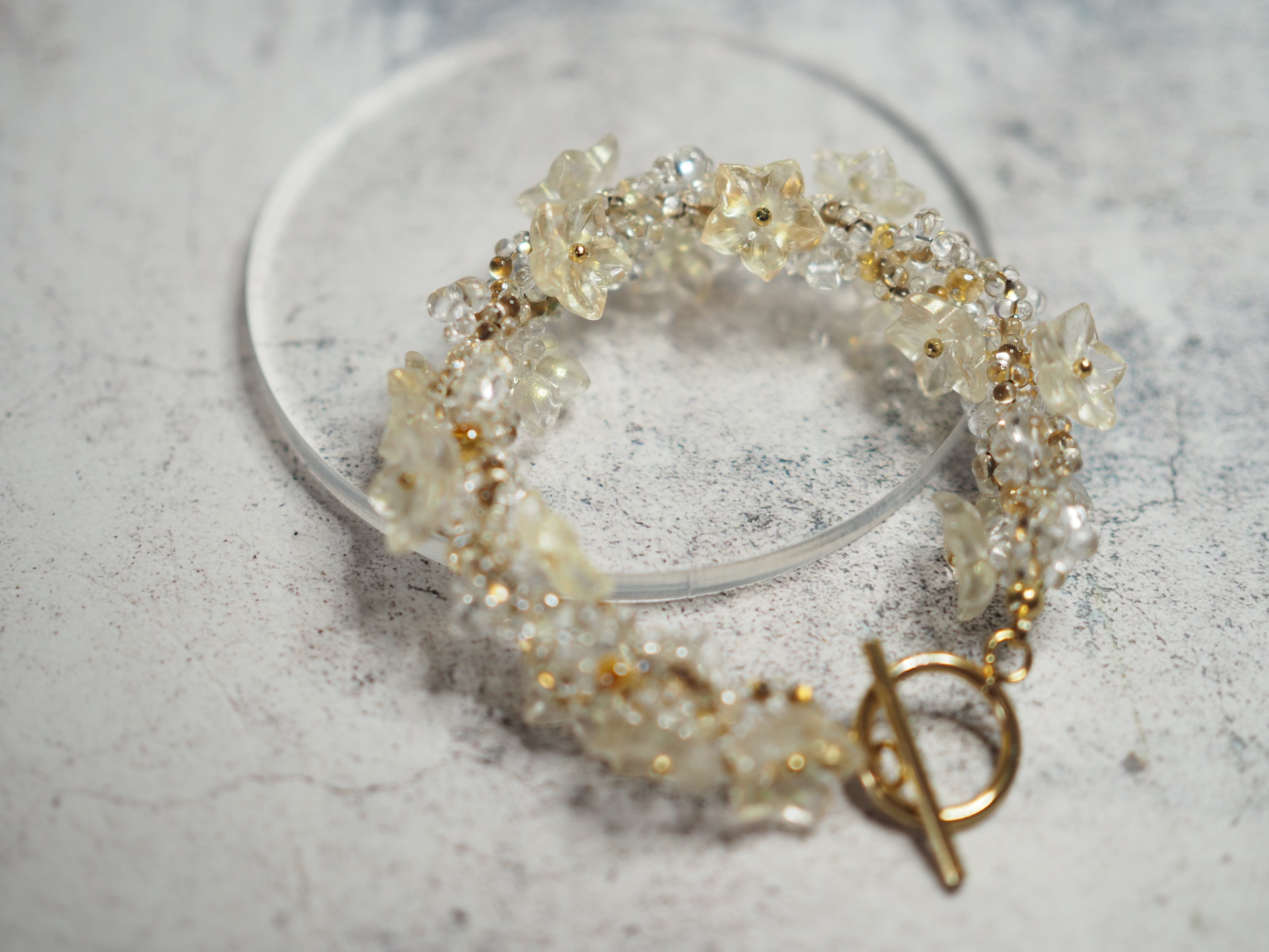 紫陽花をイメージし、ガラスのお花パーツ、ガラスビーズでブレスレットを編み上げました。
