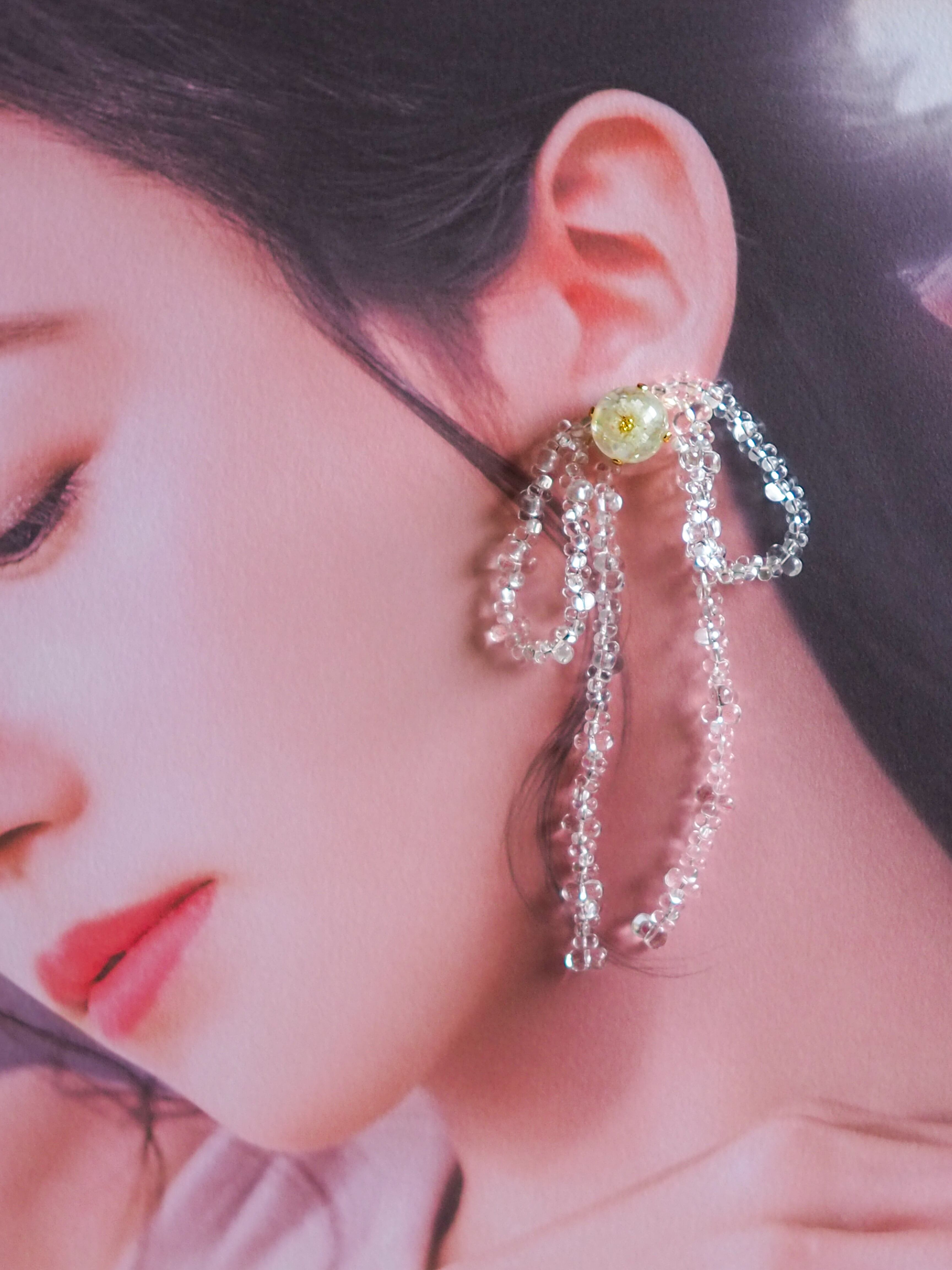本物のかすみ草をレジンに閉じ込め、ガラスビーズで飾ってリボンを作りました。透明なビーズで作ったリボンが流れる水のように涼やかです。