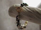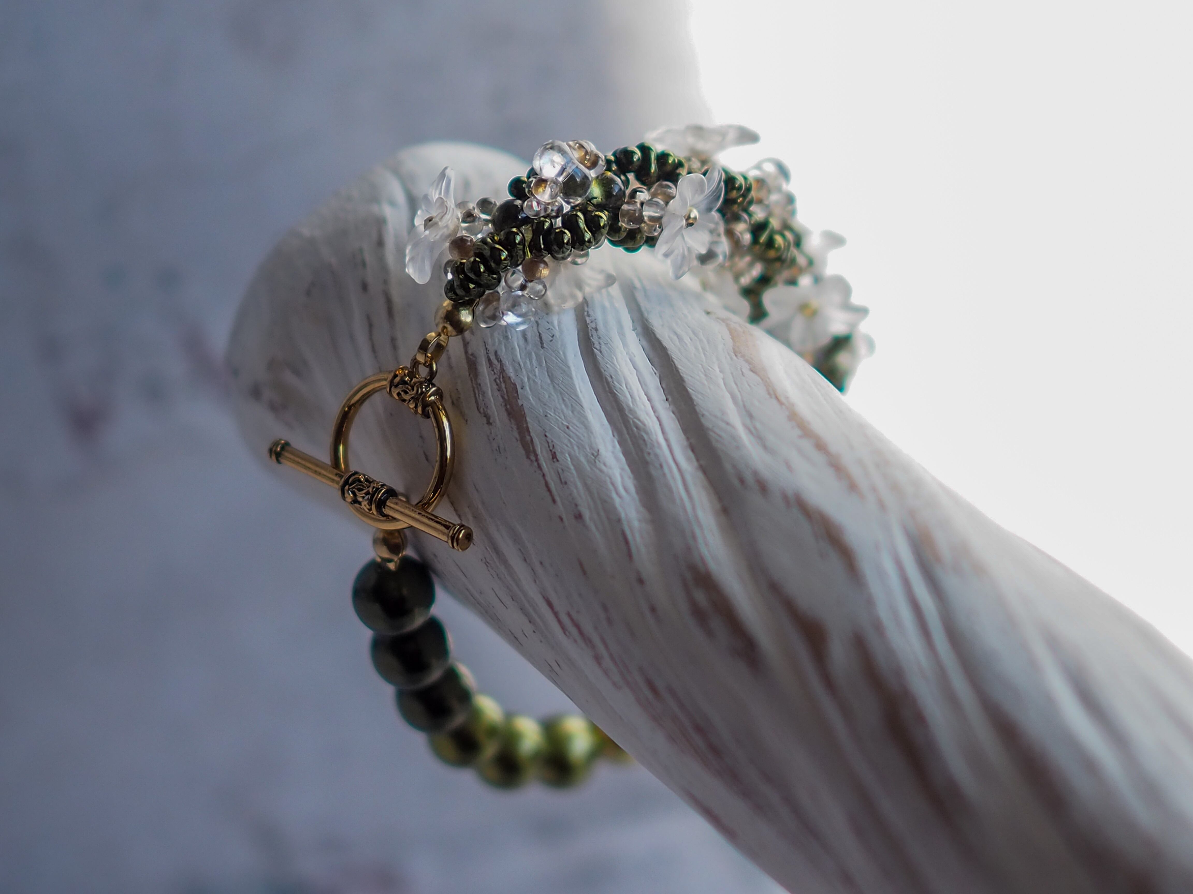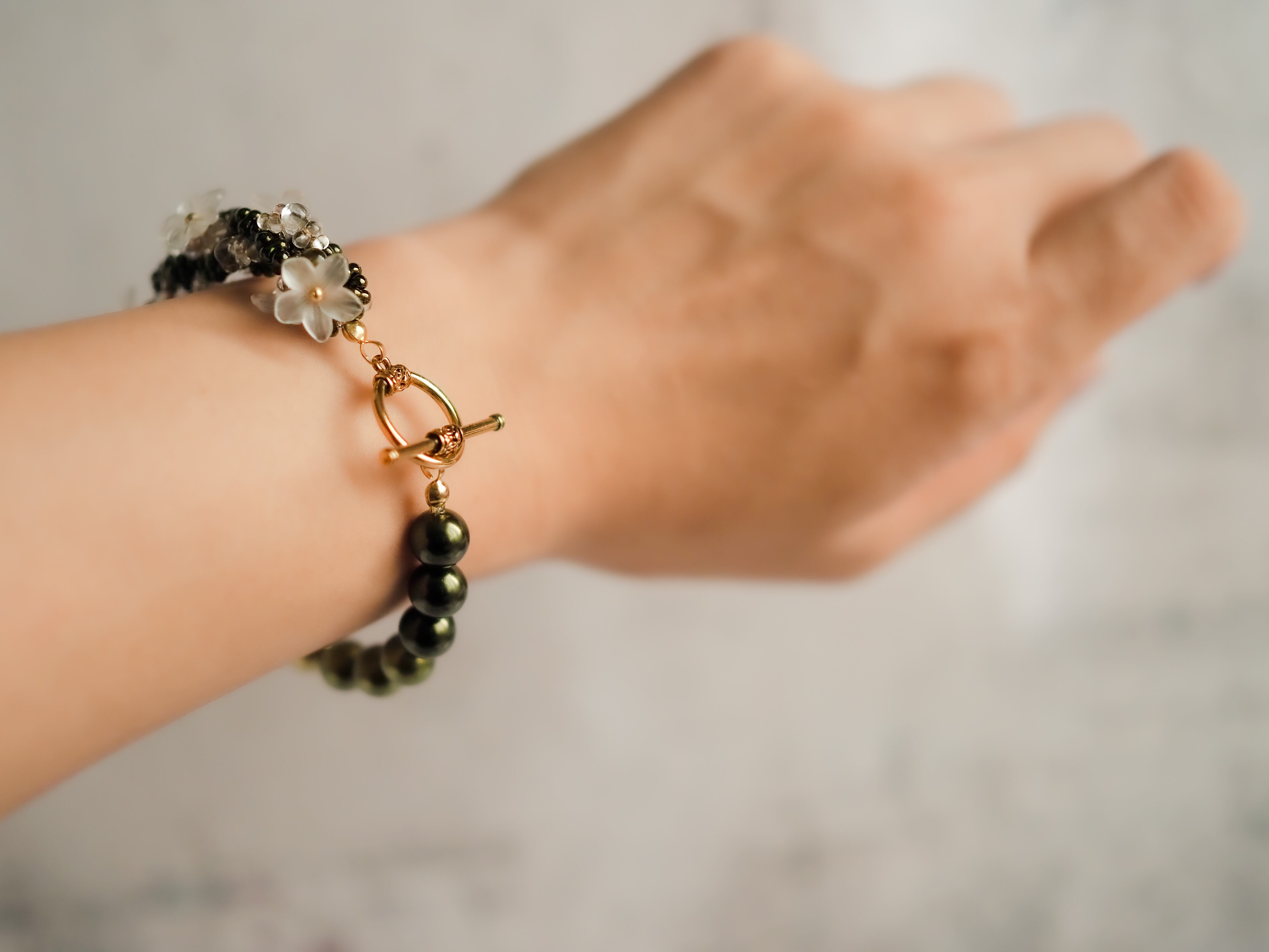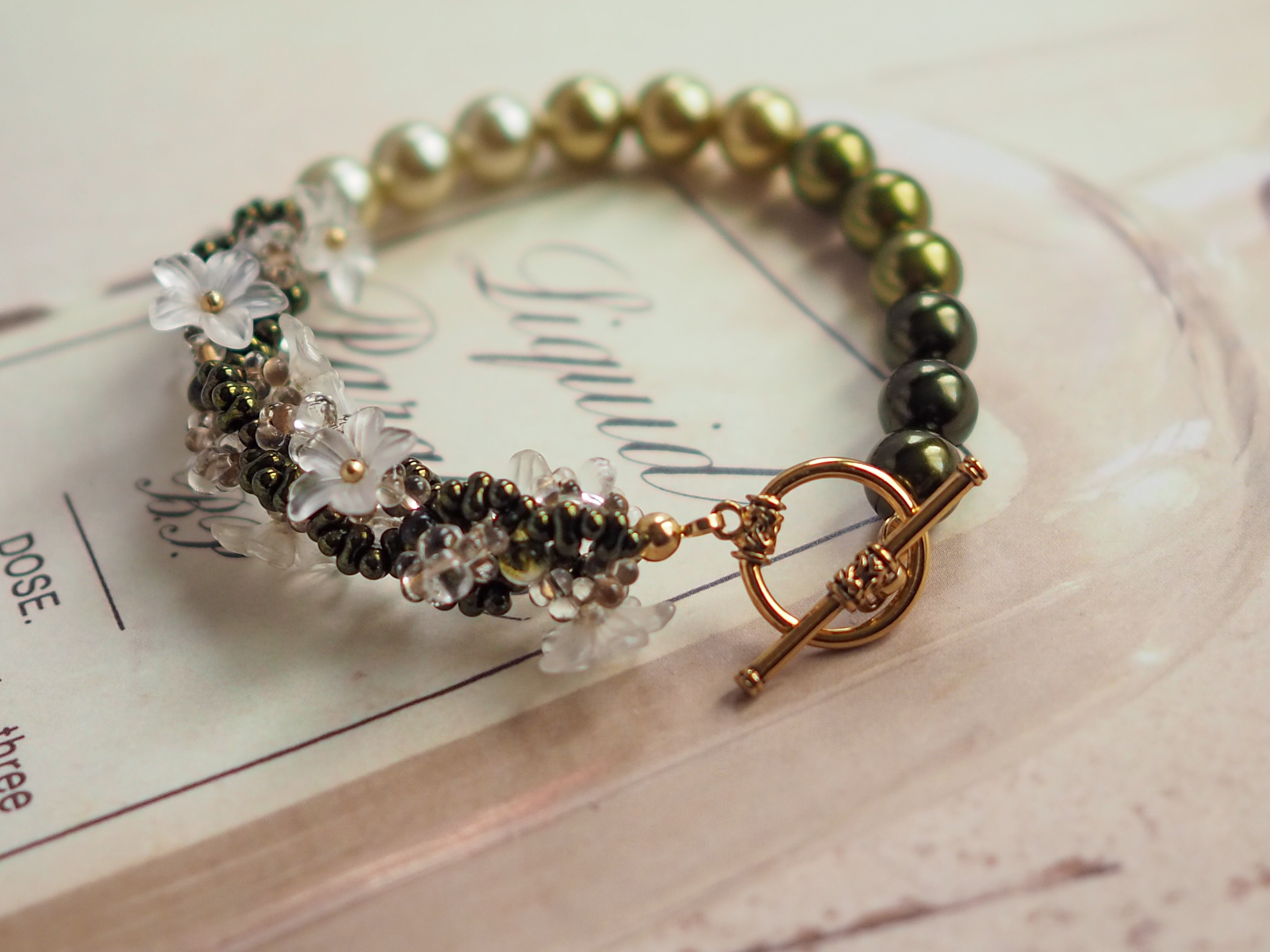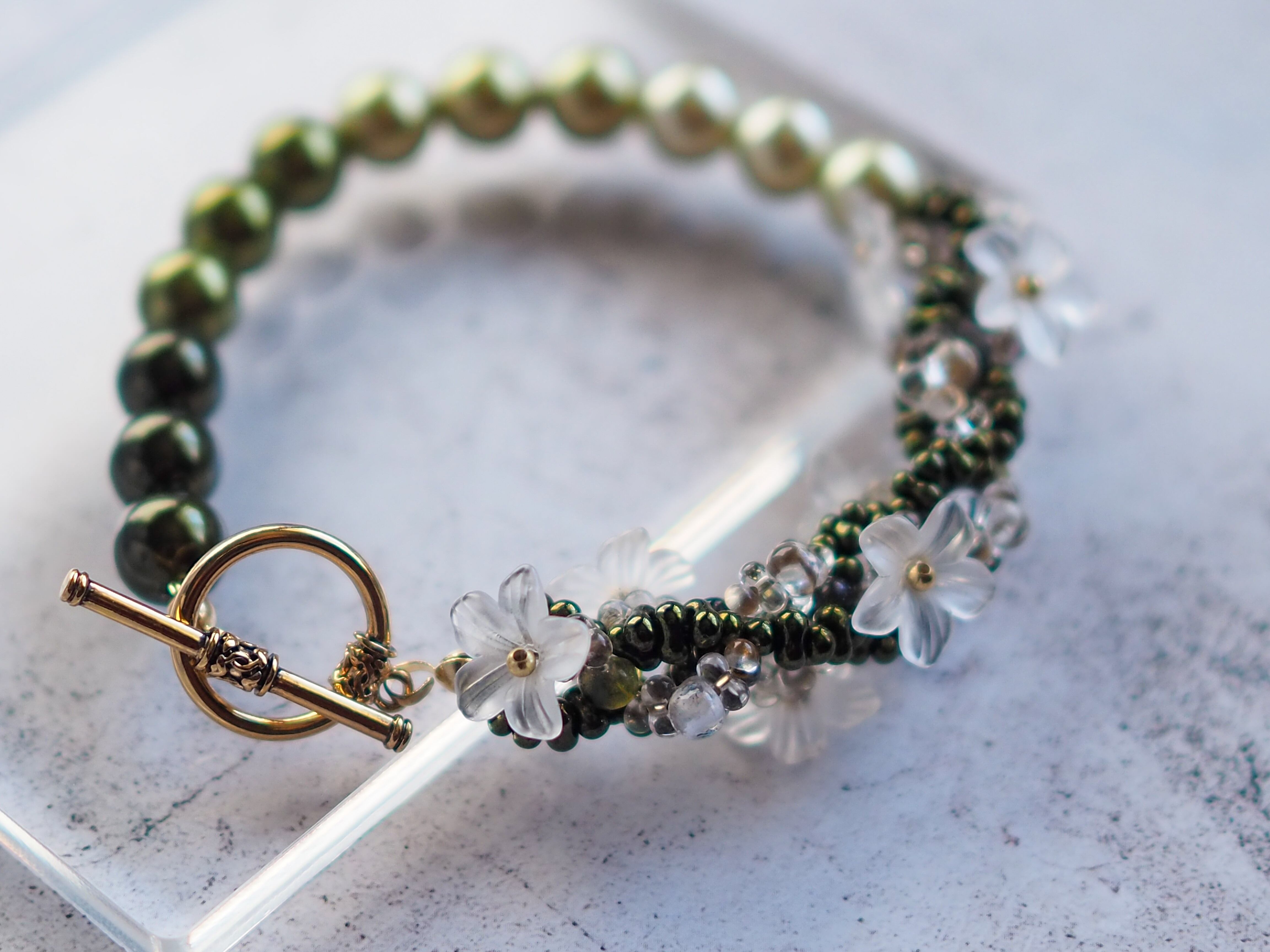 グラデーションパールとファルファーレビーズを組み合わせて編み上げたブレスレットです。