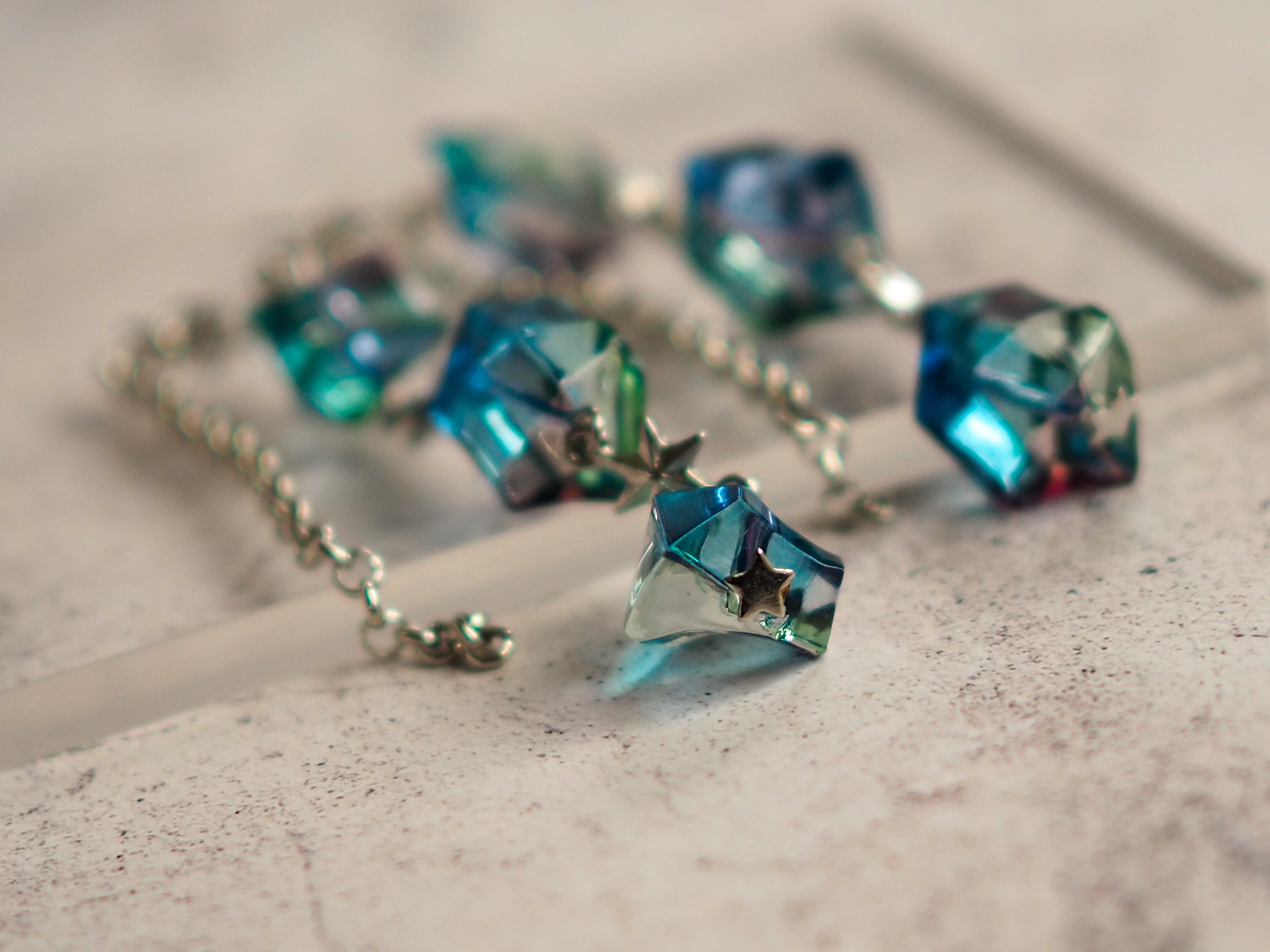 グラデーションカラーが美しい手染めアクリルビーズを耳飾りに仕立てました。光を受けて多彩に輝き揺れる様が、身に着けた方を美しく際立たせます。