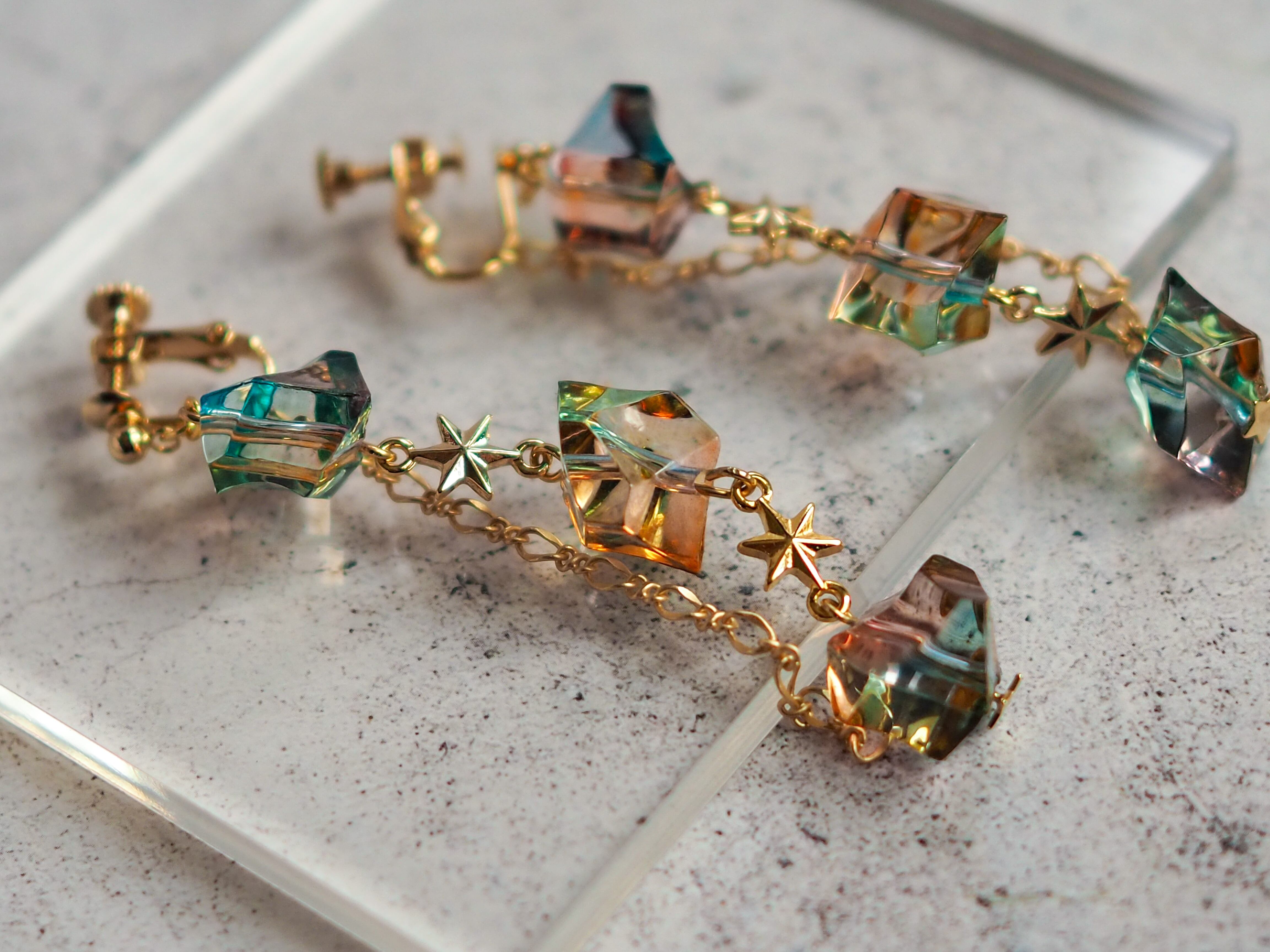 グラデーションカラーが美しい手染めアクリルビーズを耳飾りに仕立てました。光を受けて多彩に輝き揺れる様が、身に着けた方を美しく際立たせます。