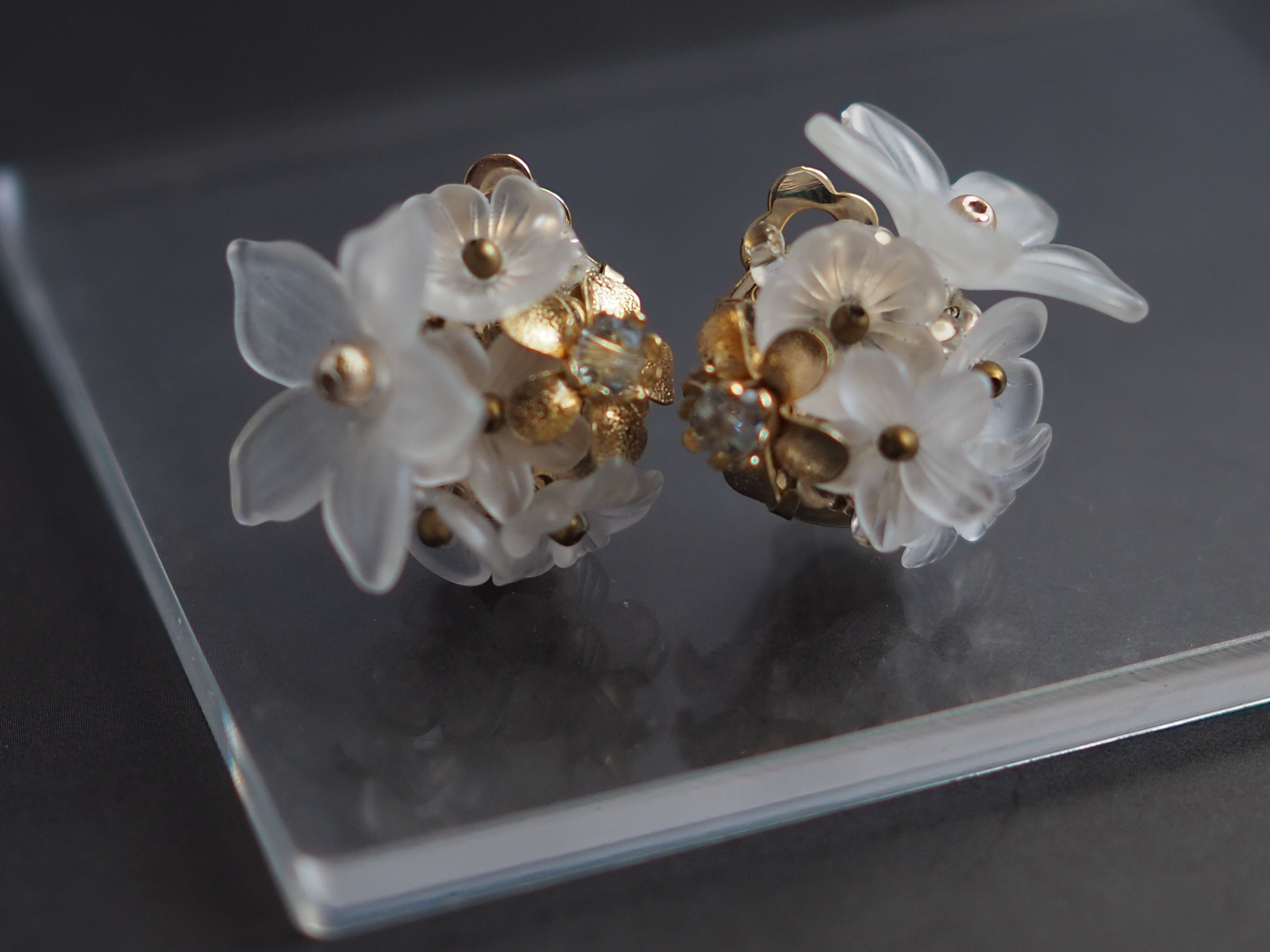 磨りガラスのような風合いのお花のアクリルパーツと、メタルフラワー、スワロフスキービーズを組み合わせたイヤリングです。クリップ式イヤリングのみでのご用意となります。
