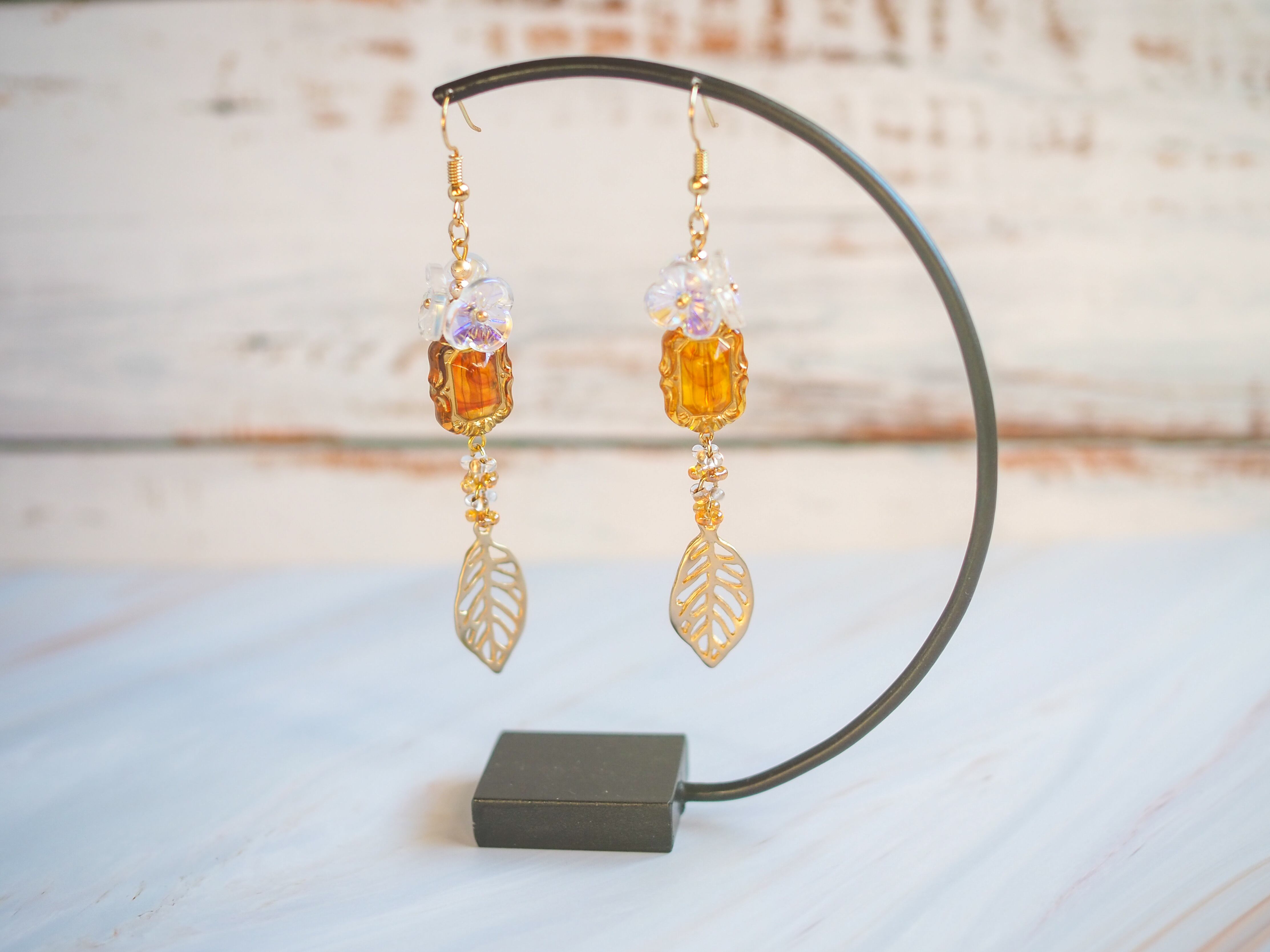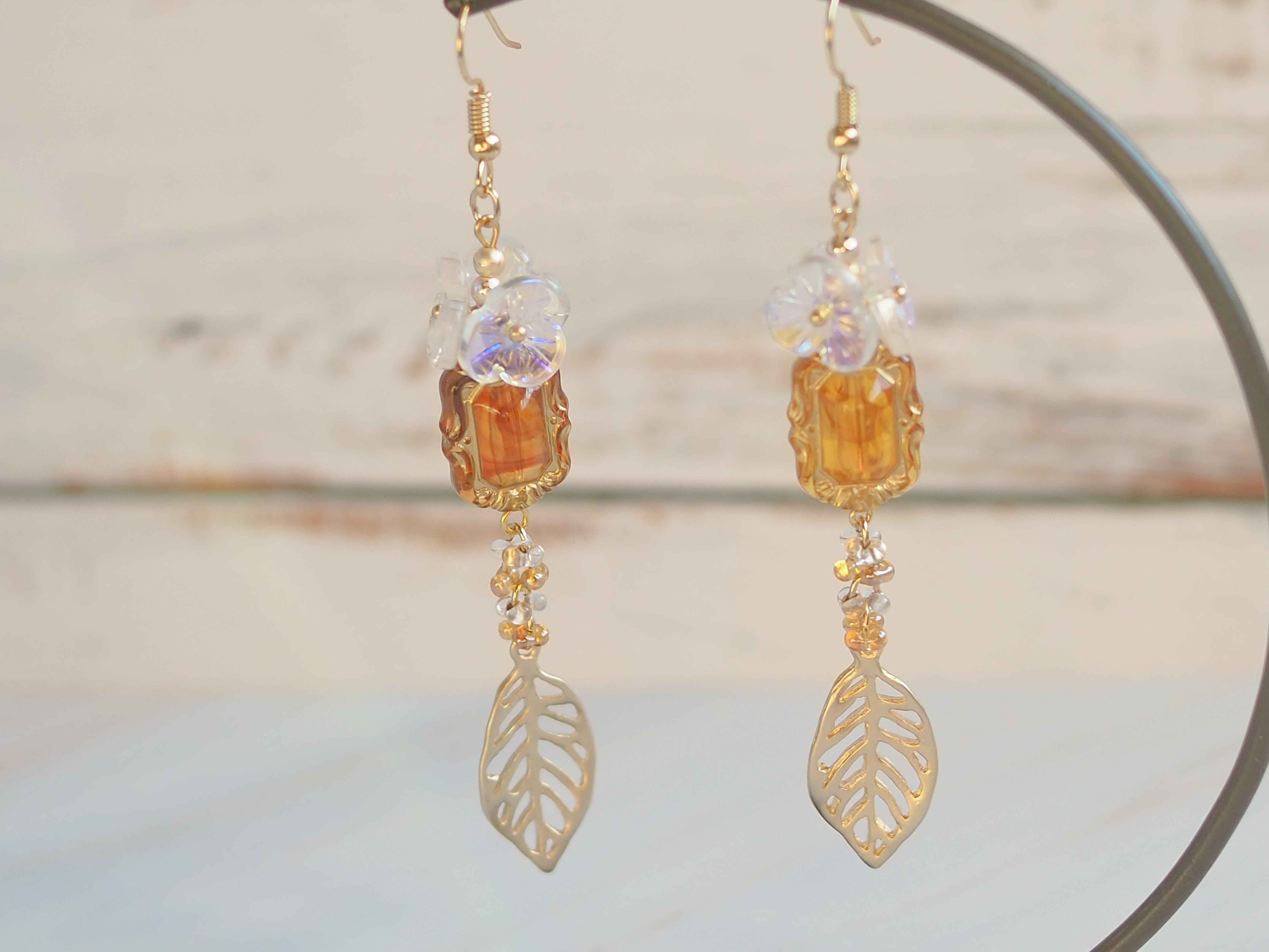 紅茶色のビーズにオーロラカラーのガラスのお花、マットな質感の葉っぱのメタルチャームを、ゆったりとしたお茶の時間をイメージした形に仕立てました。